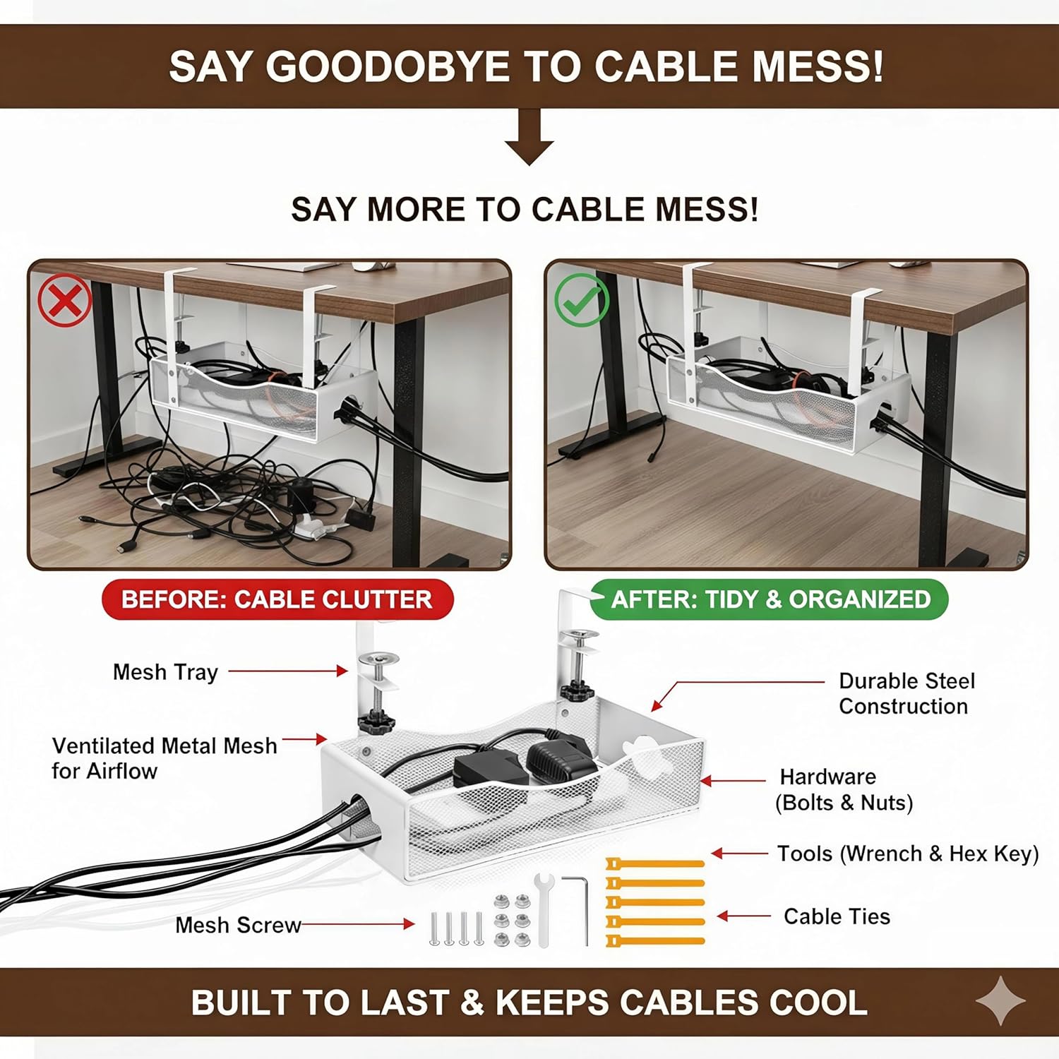 - Versatile & Multi-Device Compatibility : The Extra Wide Under Desk Cable Management Tray fits 99% of desks with its adjustable tension clamps, ensuring no slipping even on tilted standing desks. This versatile solution is ideal for home offices, gaming setups, and Coworking spaces, effectively organizing up to 15+ cables, including USB hubs, monitor wires, and smart home devices.