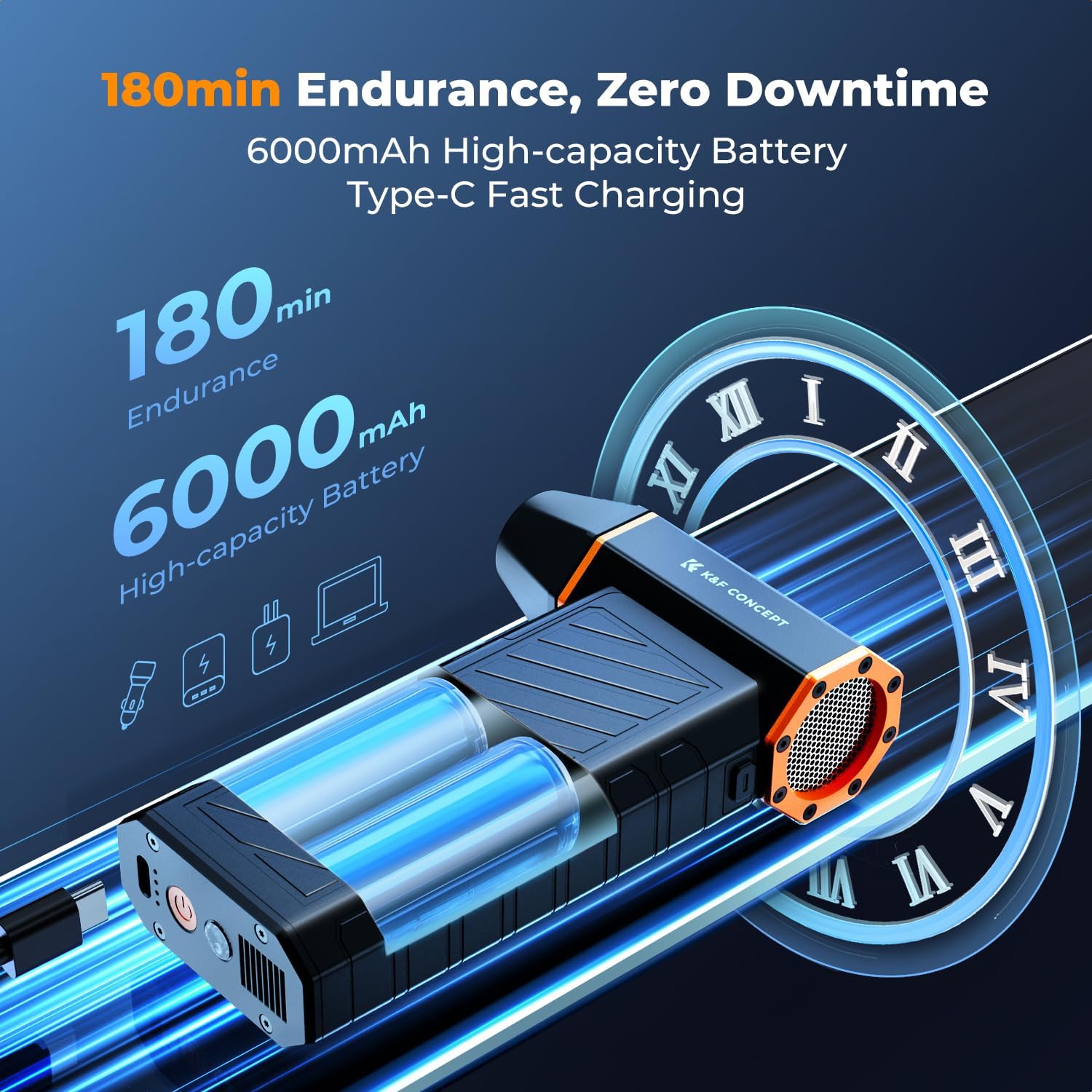 - 6000maAh POWERFUL & RECHARGEABLE - 3x Battery Capacity❗(vs. standard 2000mAh) delivers 180-minute runtime, with intelligent thermal protection: High-Speed Mode auto-shutoff activates after 10 minutes of continuous use to prevent motor overheating.