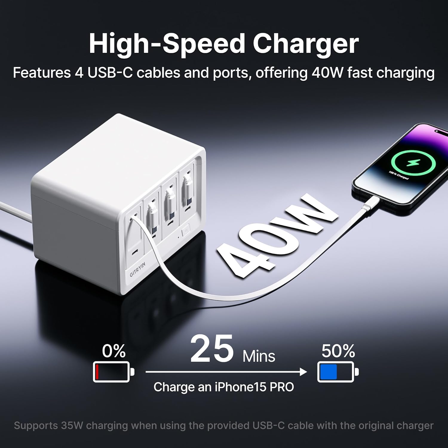 - All-in-One Charging Solution: Revolutionize your workspace with 4 AC outlets, 4 USB C ports, 4 retractable 40W Type-C wall chargers in one sleek hub. Power laptops, phones, tablets, smartwatches, and more simultaneously—eliminate outlet shortages and tangled cables while maximizing charging efficiency.