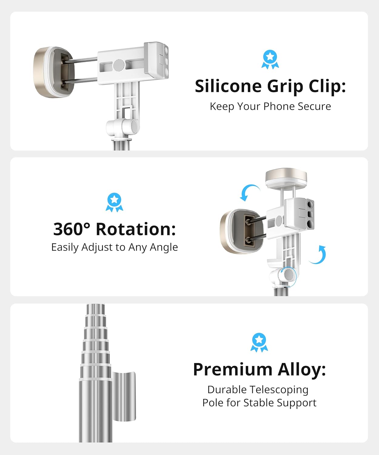 - What You Get: The package includes: 1 x Selfie Stick, 1 x Bluetooth Remote, and 1 x User Manual. For any issues, please contact us. Enjoy peace of mind with our 12-month replacement service and dedicated support