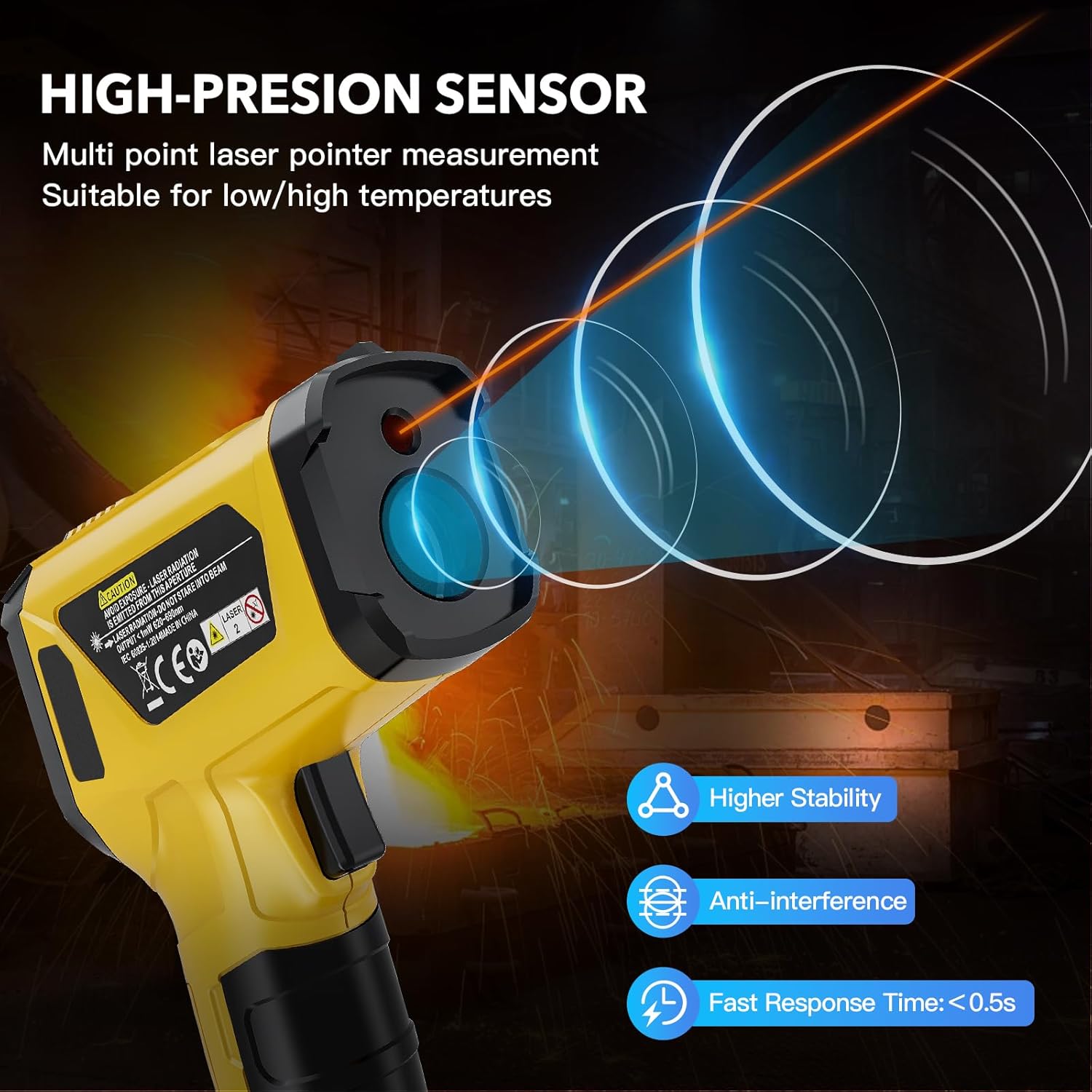 - HIGH ACCURACY & ADJUSTABLE EMISSIVITY - INSTRODOTS IR02A Non-contact Infrared thermometer with 13 Points Laser Guidance system, it offers accurate measurements from -58°F to 1472°F(-50~800°C). Also with Adjustable Emissivity From 0.1 To 1.0, facilitating accurate temperature readings across different materials. French HTU20 High-quality sensors can can provide dependable measurement within 0.5 seconds. This infrared thermometer is specially designed for inanimate objects, NOT for human or animals