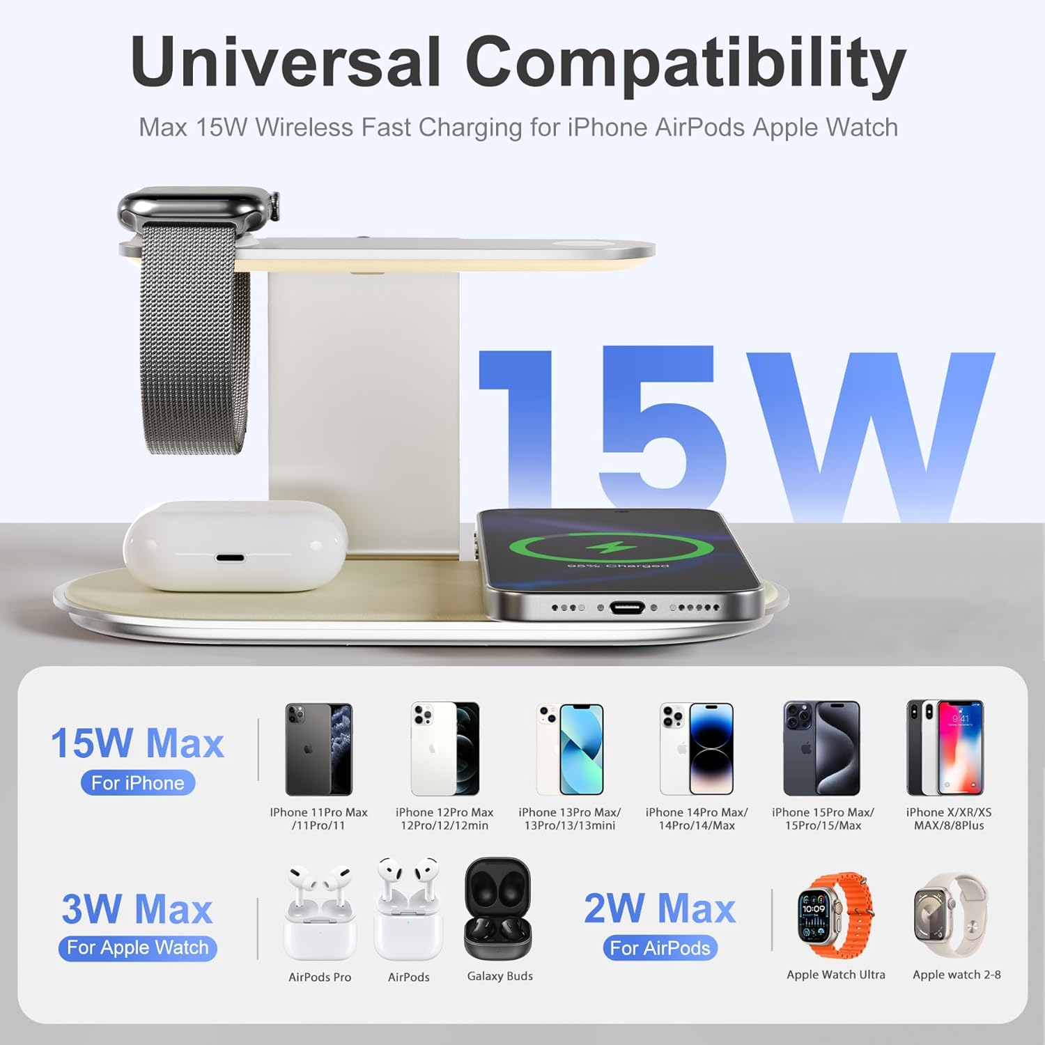 - Broad Compatibility: The 4-in-1 mag-safe charger stand is compatible for multiple devices, including iPhone 16 15 14 13 12 11 8 Pro Max Mini Plus X XR XS Max SE Plus Series, Apple Watch Series 10 9 8 7 6 5 4 3 2 SE and Ultra, AirPods 2 3 4 Pro 1 2 (Note: for iPhone 8/X/11 and Airpods 2 3 4, require a Mag-Safe charging case for use)