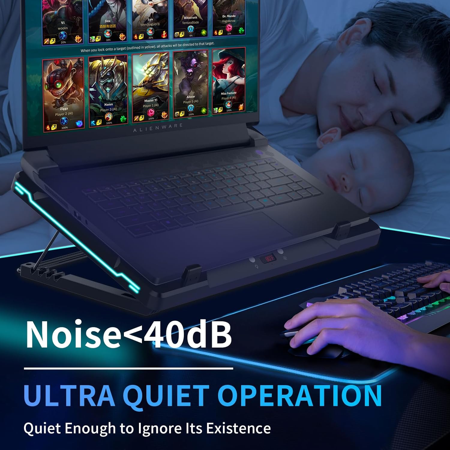 - ULTRA QUIET OPERATION ≤40DB: The laptop cooling stand designed to stay whisper-quiet even under full load. Operates at ≤40dB, ideal for late-night work, studying, or streaming without distraction