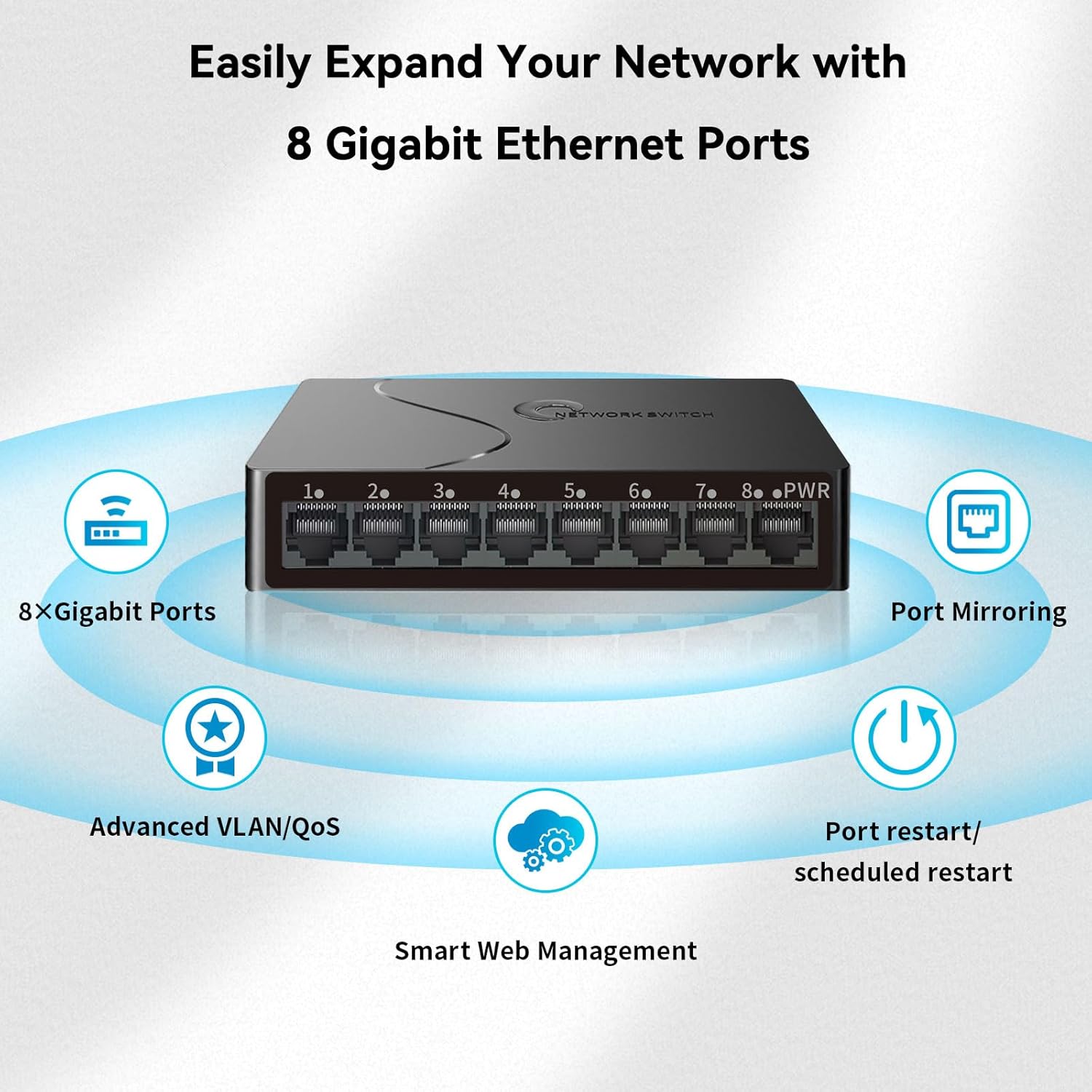 8-Port Gigabit Easy Smart Managed Ethernet Switch | Plug & Play Network Hub with VLAN, QoS, Port Mirroring | Fanless Design | Desktop/Wall Mount for Home/Office