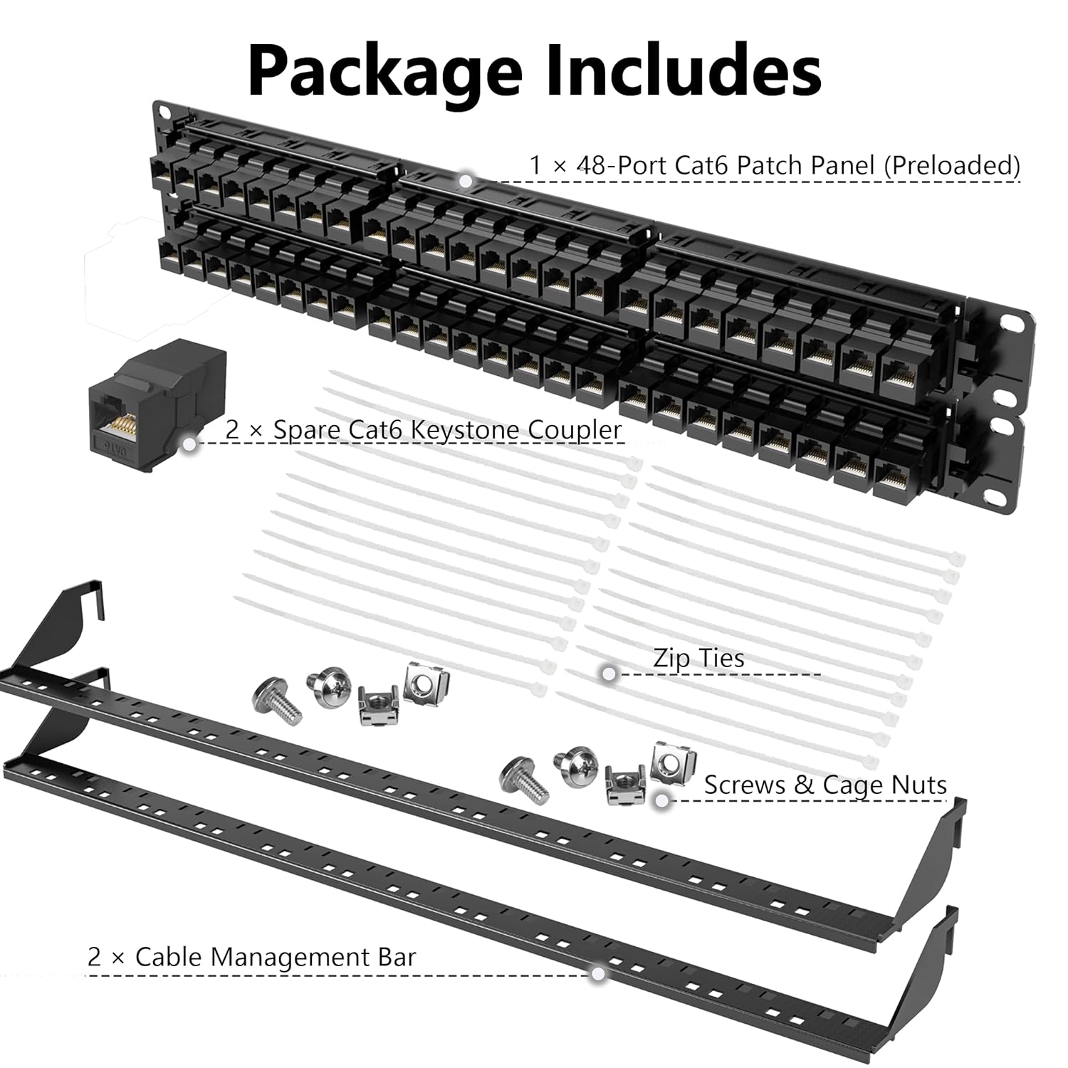 - 🔹 No Tools Needed, Save Setup Time – Preloaded with 48 Cat6 RJ45 couplers, this patch panel lets you plug cables directly without punch-down tools. Installation takes only minutes, saving up to 70% time compared to traditional panels.