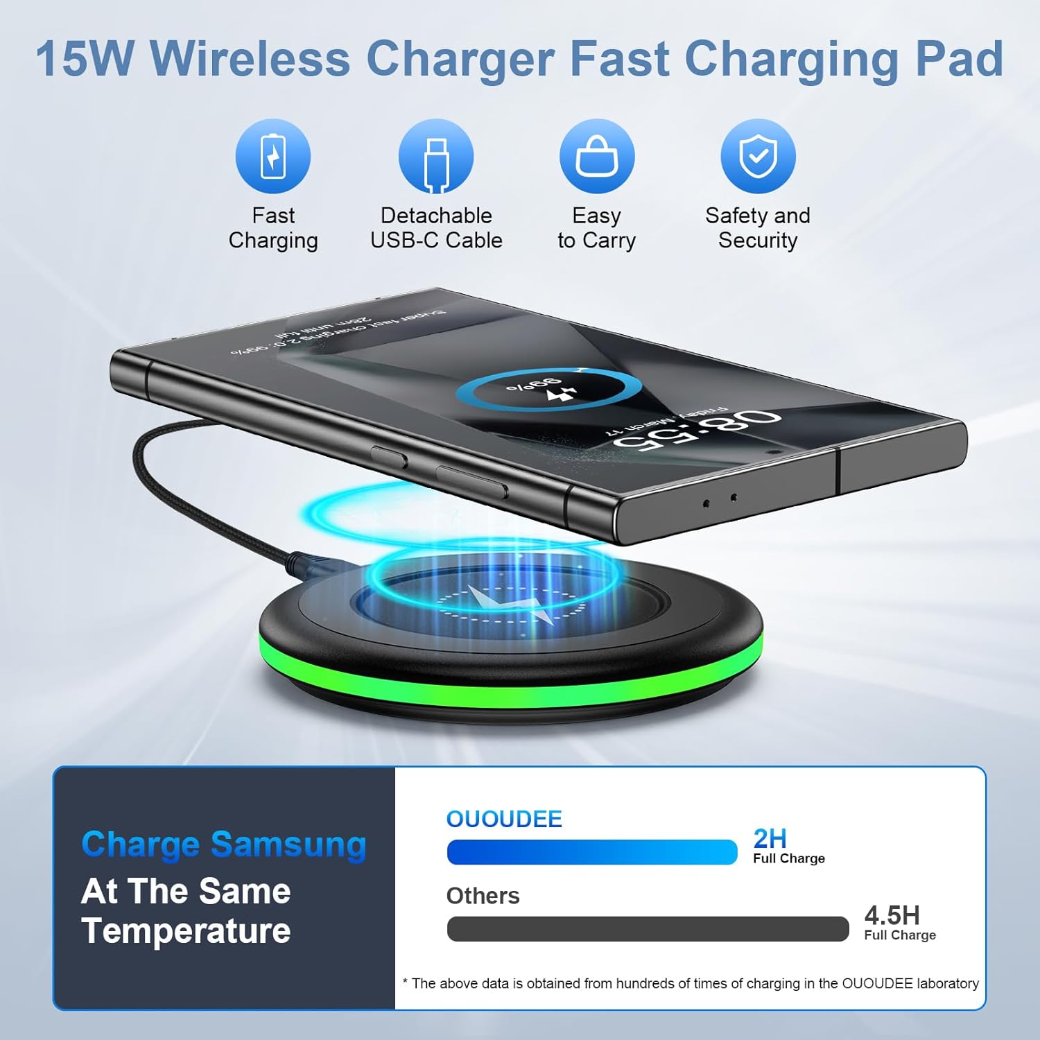 - 【Non-slip Design & Case friendly】:The up and down of the Samsung galaxy s25 ultra fast wireless charger are embedded with non-slip silicone material, so you don't have to worry about slipping problems even on a smooth desktop. It also supports charging through general plastic/silicone phone case less than 5mm thick. and the included 3FT USB c charger fast charging cord is the perfect match for wireless charger pad.