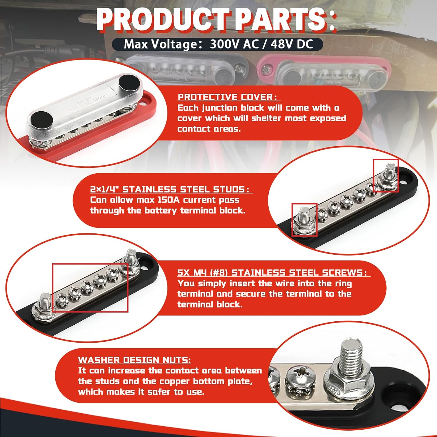 - 【1/4" Studs Terminal】 This block includes 2 x 1/4" (M6)studs terminal and 5 x M4 screw terminals, which makes the 12V junction block able to accept larger size terminal connectors and wires.