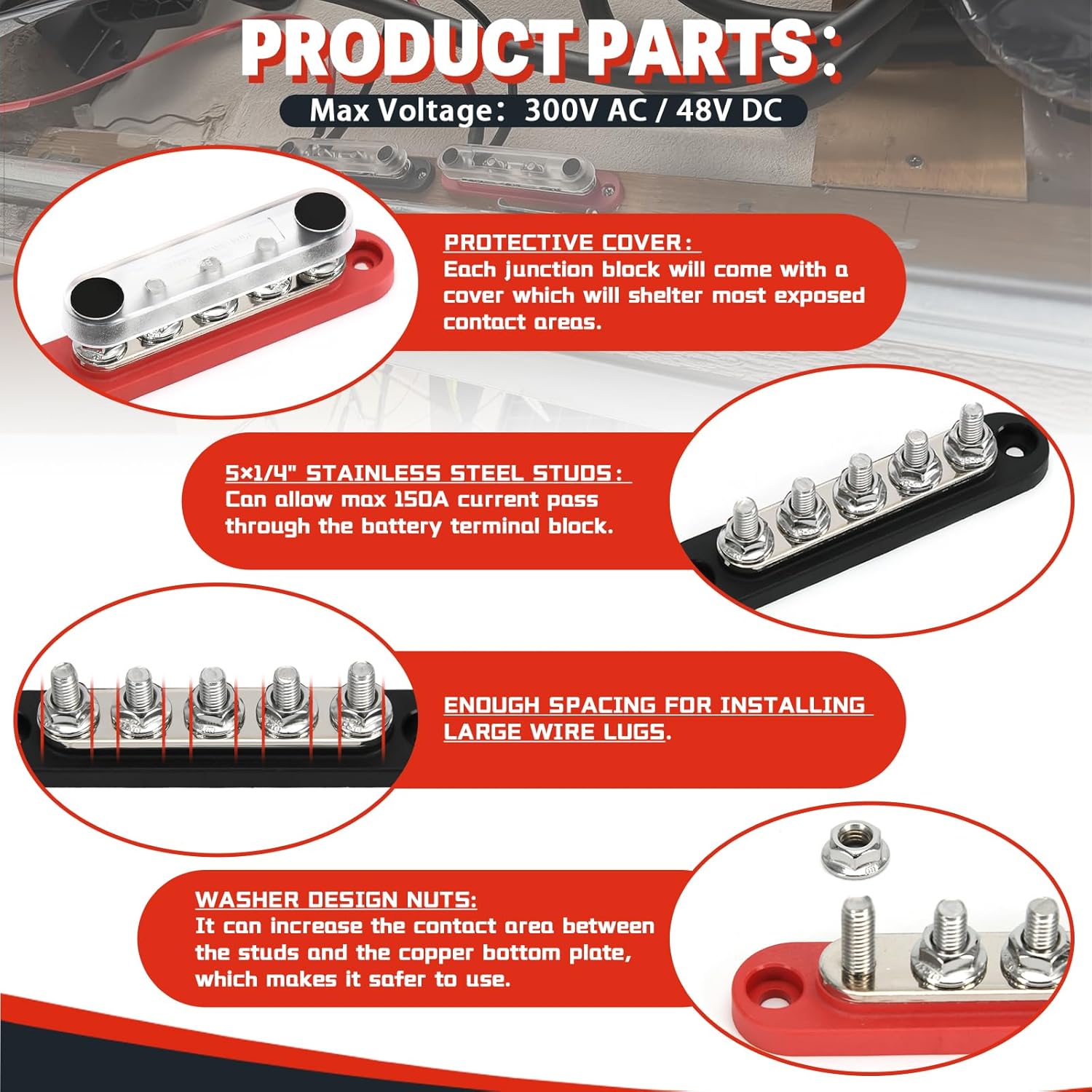 - 【1/4" Studs Terminal】This block comes with 5 x 1/4" (M6) studs terminal, which makes the 12V junction block able to accept large size terminal connectors and wires, sufficient to support safe use of rated current and voltage.