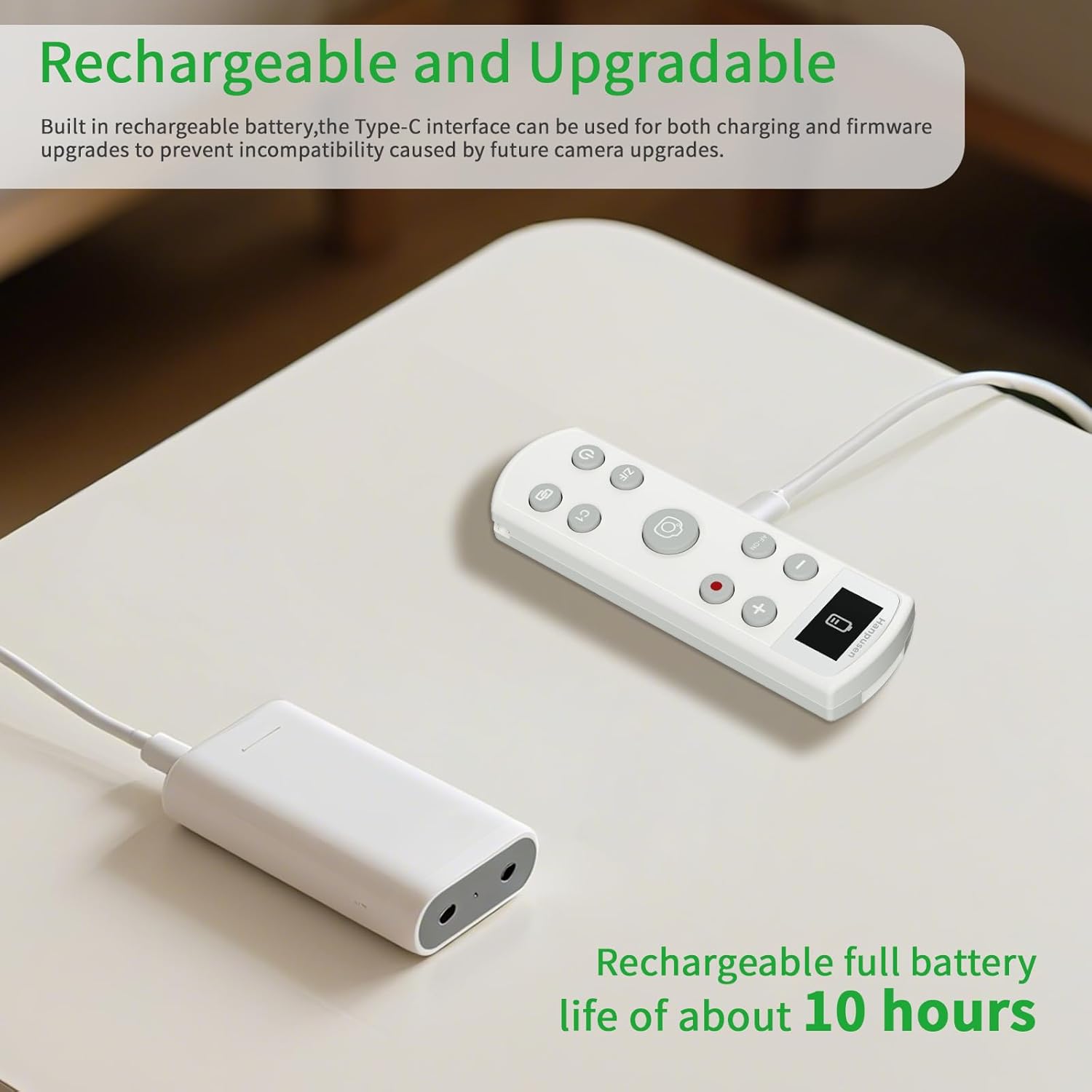 - Rechargeable Design and Firmware Upgrade: Built-in rechargeable battery with universal Type-C interface, providing up to 10 hours of continuous use on a full charge, eliminating the hassle of frequent battery replacement. The Type-C interface also supports firmware updates. If compatibility issues arise due to future camera upgrades, the remote control firmware can be upgraded via this interface.