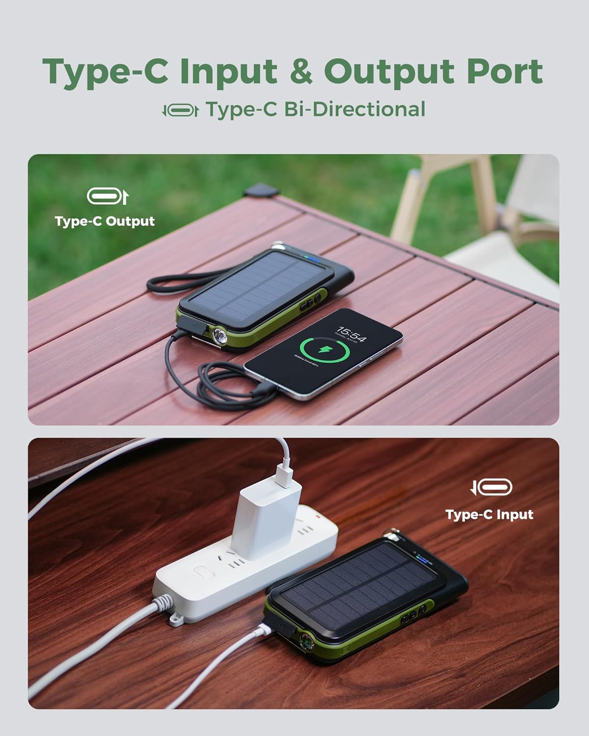 - [Power 5 Devices at Once] This solar charger is also equipped with 2 ports (USB-C input/output, USB A output), providing 5V/3A high-speed charging to save time. Our solar power bank with 2 charging cables(type-C,lightning cable) and wireless charging supports charging 5 devices simultaneously. Keep all your devices alive. Sharing with families and friends is perfect.