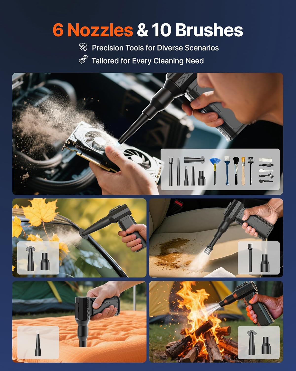 - [6 Versatile Nozzles & 10 Detail Brushes] Offer tailored solutions for every cleaning task, from delicate computer keyboards and sensitive electronics to car detailing, home deep cleans, and even outdoor inflation tasks. One tool, infinite mastery.