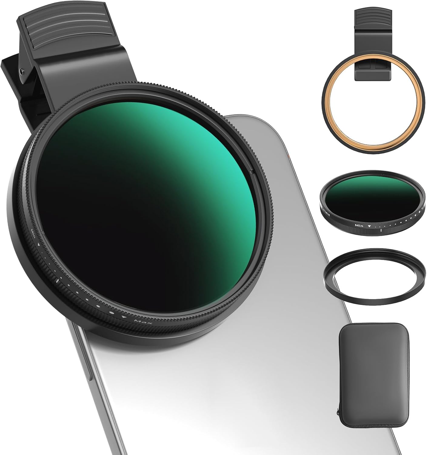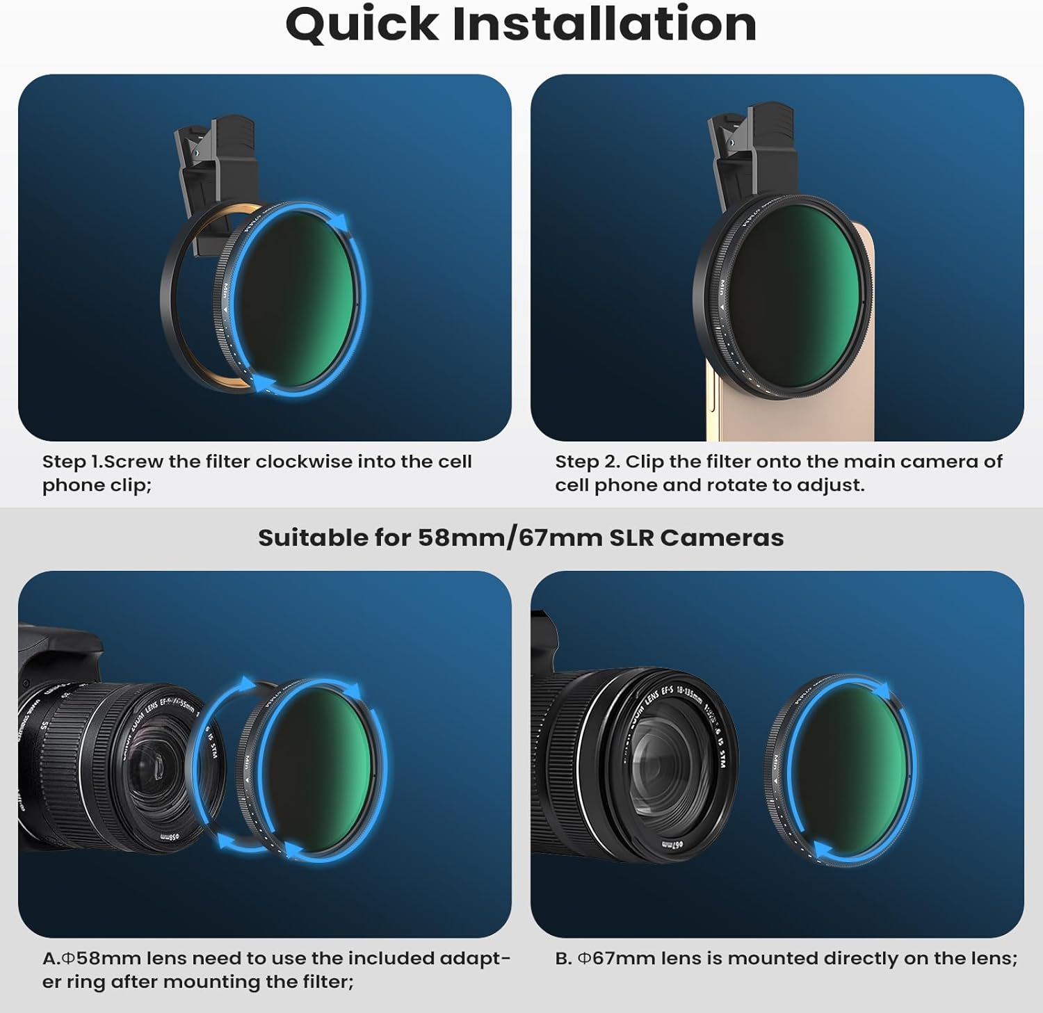 - 【2-IN-1, ND2-400 Filter for Phone & 58mm/67mm Camera】: Widely compatible, this clip on 67mm adapter neutral density filter kit is designed for all smartphones and any DSLR cameras with a 58mm/67mm filter thread. The newly upgraded universal cell phone clamp is compatible with iPhone 16 15 14 13 12 11 Samsung Galaxy S25 S24 S22 Ultra and other models. Essential photography accessories for professional content creators and must-have gear for influencers. (Includes 58mm-67mm threaded adapter ring)