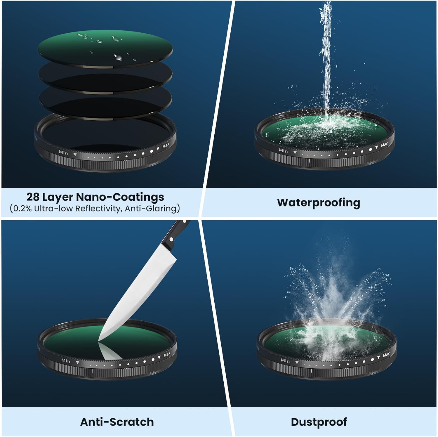 - 【1-10 Stop ND2-400 Filter】: The 67mm ND2 - 400 filter for iphone/DSLR camera is a master of light control, adjustable light reduction from 1 - 10 stops by rotating. Its 28 - layer nano - coating effectively reduces glare and enhances image quality. It supports slow shutter speeds and wide apertures, perfect for dynamic blur effects and precise depth - of - field control. Whether you're capturing landscapes, cityscapes, astrophotography, or video, this filter delivers professional - quality results.