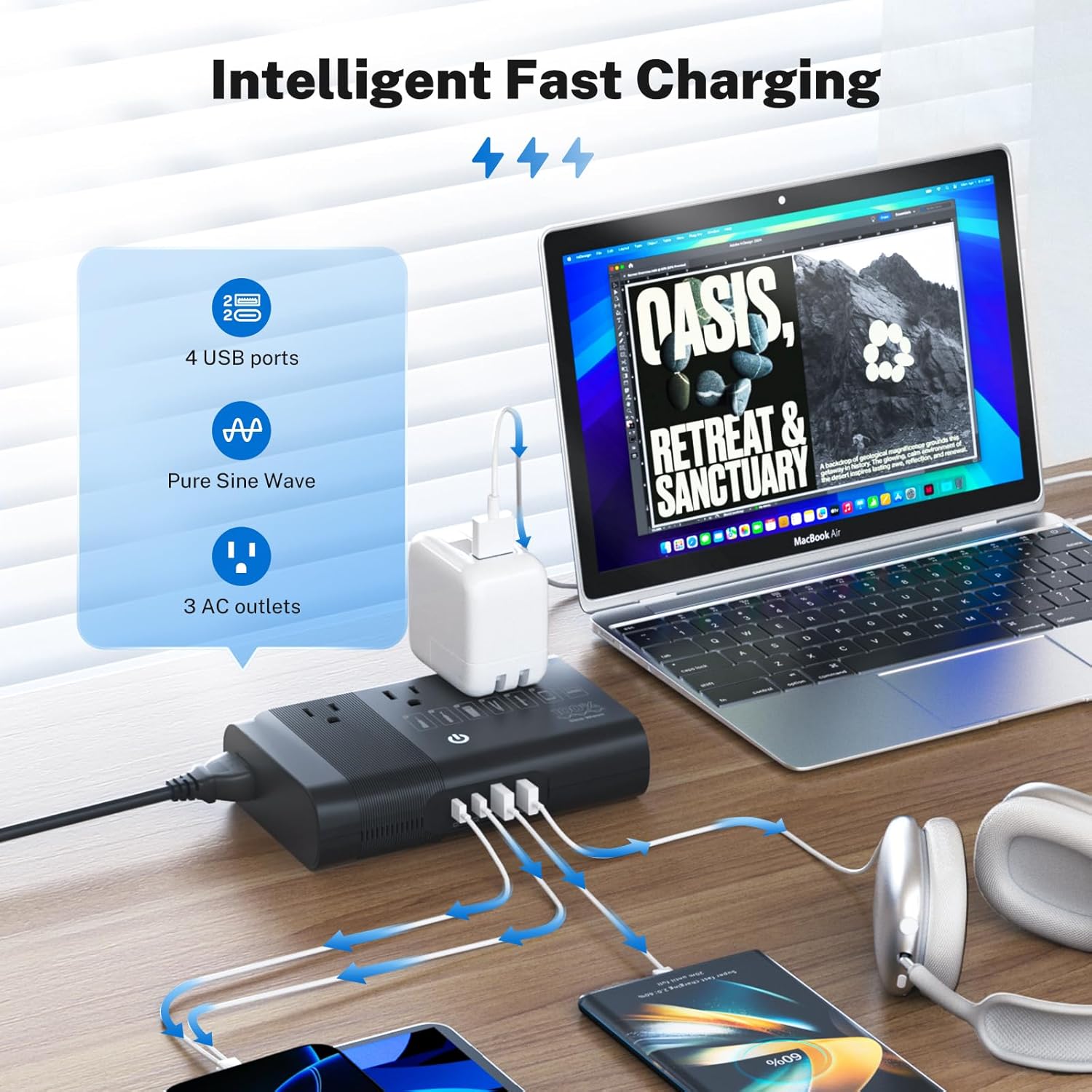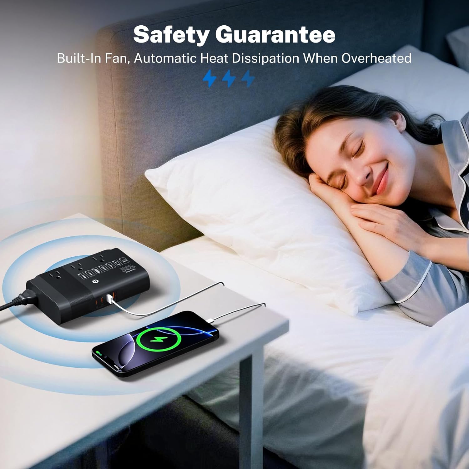- ✅Fast Multi-Device Charging: Charge 7 devices at once with 3 US sockets, 2x20W USB-C (PD), and 2x18W USB-A (QC). . Ideal for families or professionals with multiple gadgets, it handles phones, tablets, laptops, and small appliances efficiently. Total 500W power limit prevents overloads, keeping charging safe and steady.