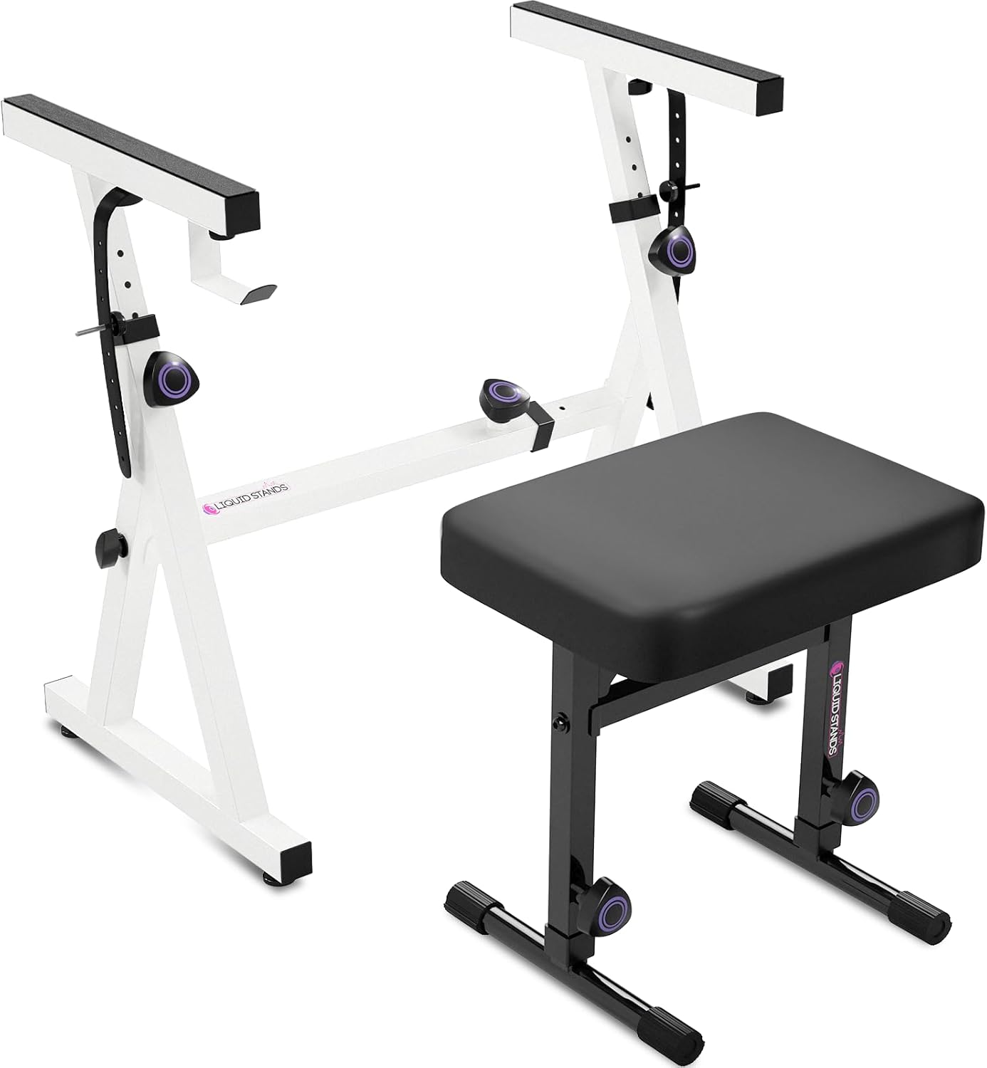 Liquid Stands Portable Heavy Duty Digital Piano Stand & Bench Set - Adjustable Keyboard Music Stand & Seat for 54-88 Key Electric Pianos (White)