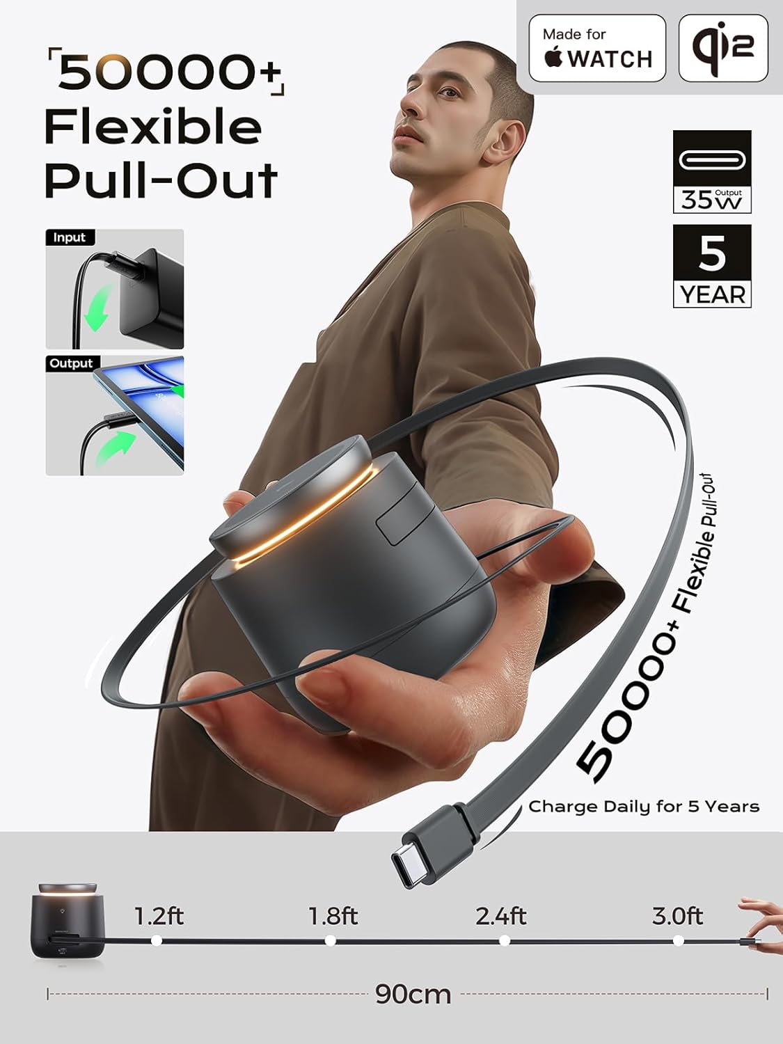 - ⚡【Additional 3FT Retractable Cord】Based on the traditional 3 in 1 charging dock, we have additionally designed a built-in 3ft retractable cable, it can be used for either input or output. When used as an input, it can be connected to an adapter to supply power to this charger cube. When used as an output, it can charge your fourth device, be it your iPad or Android device. It keeps you away from the hassle of tangled wires and truly serves as the ultimate solution for your wireless charging needs and it can be adjusted in several levels to meet different length needs. 50000+ pull-out test to ensure durability and safety, eliminating concerns about product longevity or structural integrity.