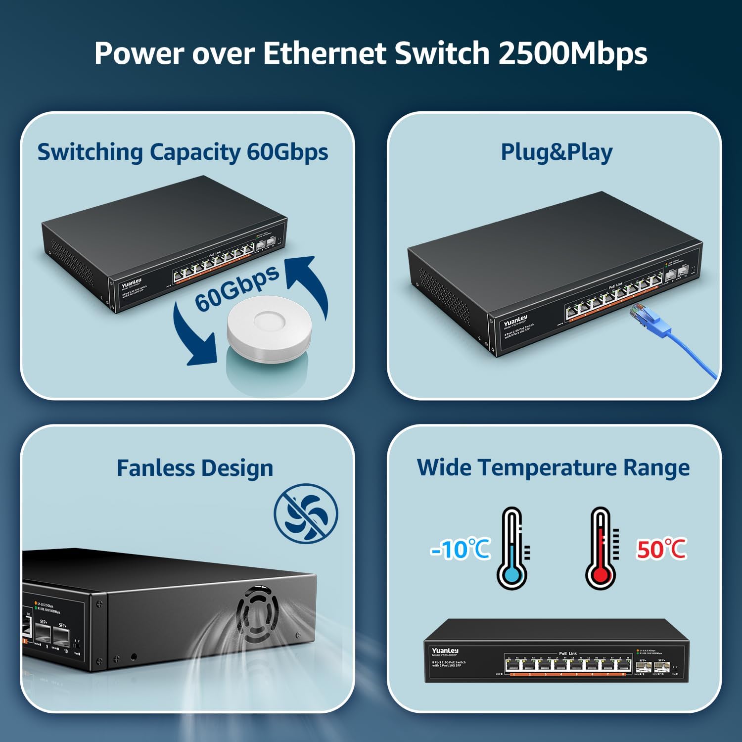 - 【2.5G PoE Switch】The network switch includes 8 x 2.5 Gigabit PoE ports, 2 x 10G SFP Port (Compatible 1G/2.5G Module, not include SFP Module). Ports 1-8 Compliant IEEE IEEE802.3bz (2.5G) standard, support 10/100/1000M/2.5G adaptive, Auto MDI/MDIX.