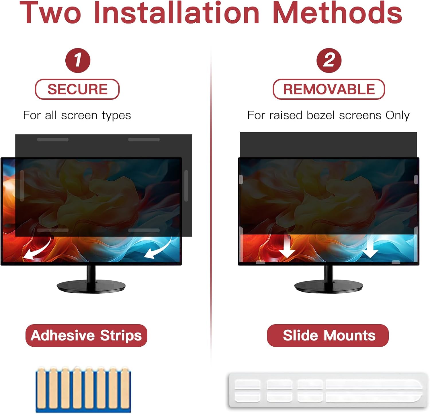 - 【Two Attachment Options】Our computer privacy screen 24 inch can use 2 installation options complete installation quickly, perfect fit with no bubbles. Option 1 you can apply clear adhesive strips directly on the monitor privacy screen filter to securely attach to any computer monitor screen; Option 2 (for computer screens with a raised bezel only) use slide mount tabs that easily stick to the display frame, allowing you to slide the privacy screen filter on and off as needed.