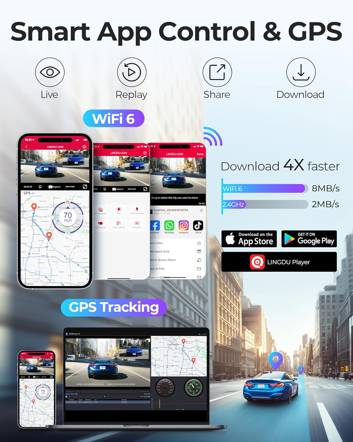 - 【Superfast 5.8GHz WiFi for Instant Sharing】 Enjoy ultra-fast video transfers with upgraded 5.8GHz WiFi. Simply connect your smartphone via the LINGDU app (iOS & Android supported) to preview, download, and share footage on the go—no cables, no delays