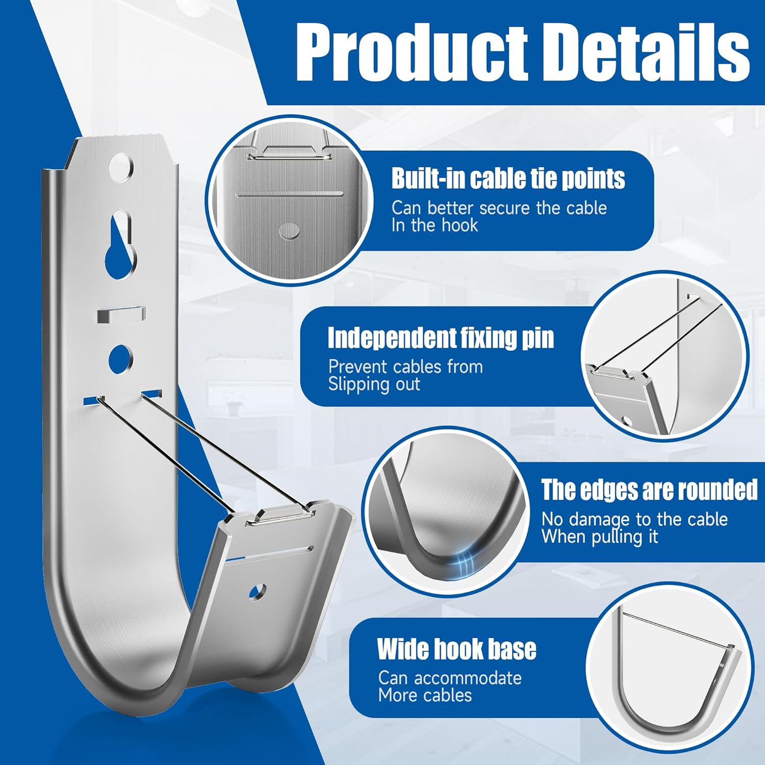 - Reinforced design: Each J-hook is equipped with a retaining clip to hold the cable in place and prevent the cable from slipping out of the J-hook, and the cable hooks have built-in cable anchors to allow the user to use cable ties to further secure the cable, providing additional security and stable support for your cable routing.