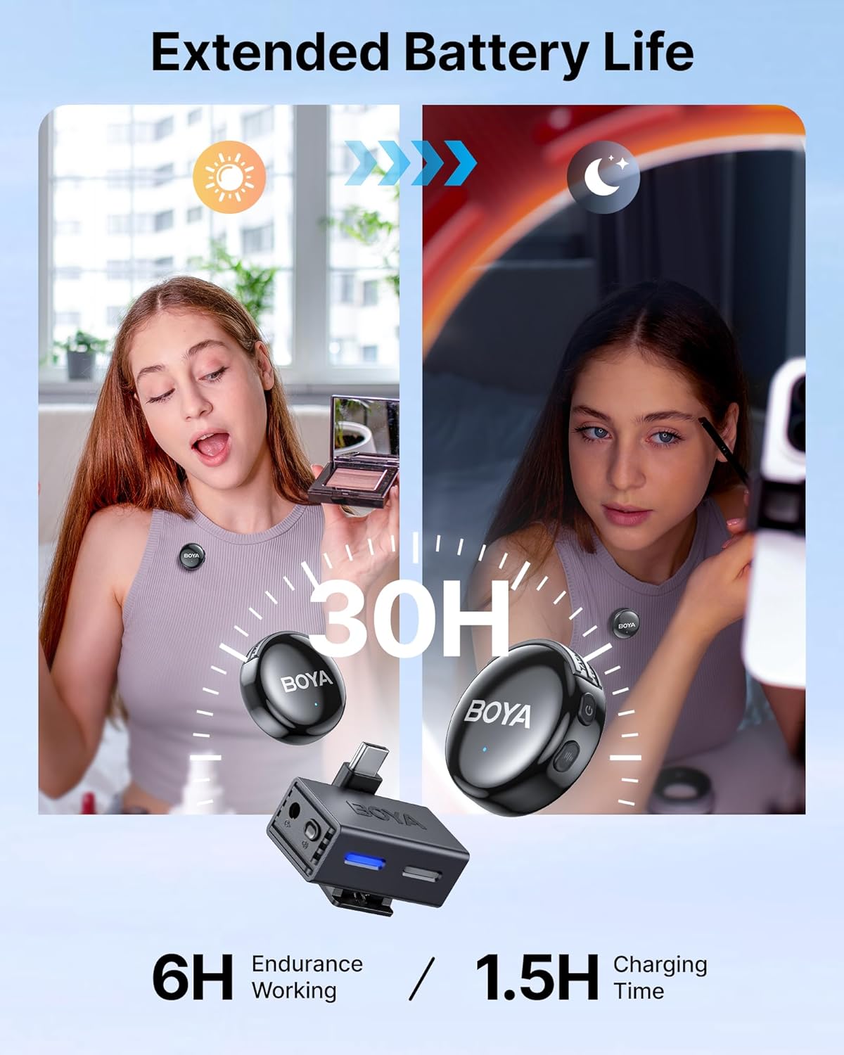- 12H Total Power & Extended 984ft Range: BOYALINK3 lapel microphone wireless delivers 6-hour mic runtime while two clip on wireless microphones alternate seamlessly for up to 12 hours of total runtime. With stable 2.4GHz transmission reaching up to 984ft (300m) in open spaces, BOYALINK 3 mini mic ensures reliable audio capture for mobile journalism, vlogging.
