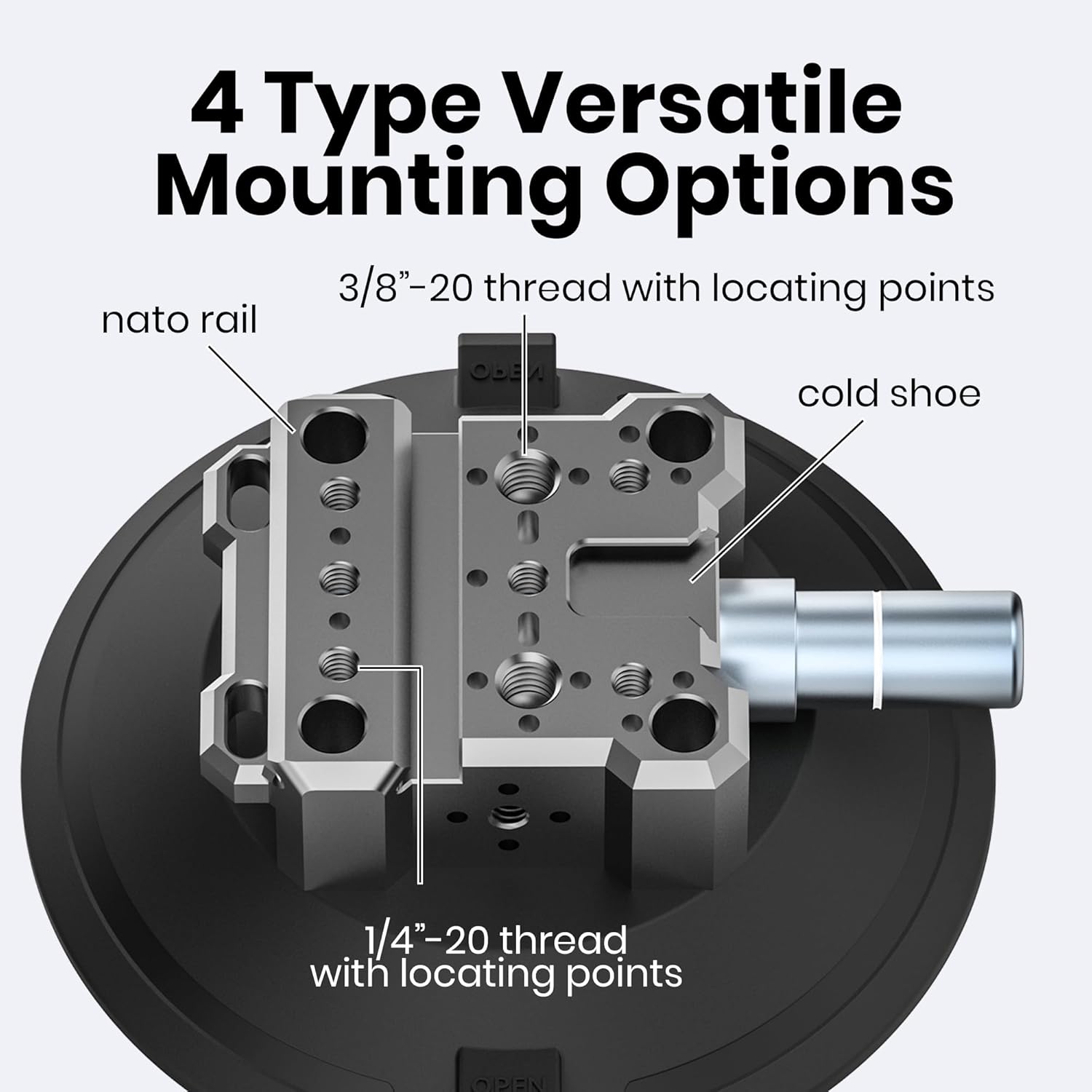 6" Suction Cup Camera Mount – Ultimate Car Camera Mount with Cold Shoe, NATO Rail, and Threaded Holes for Cameras, Action Cameras, Phones (6")