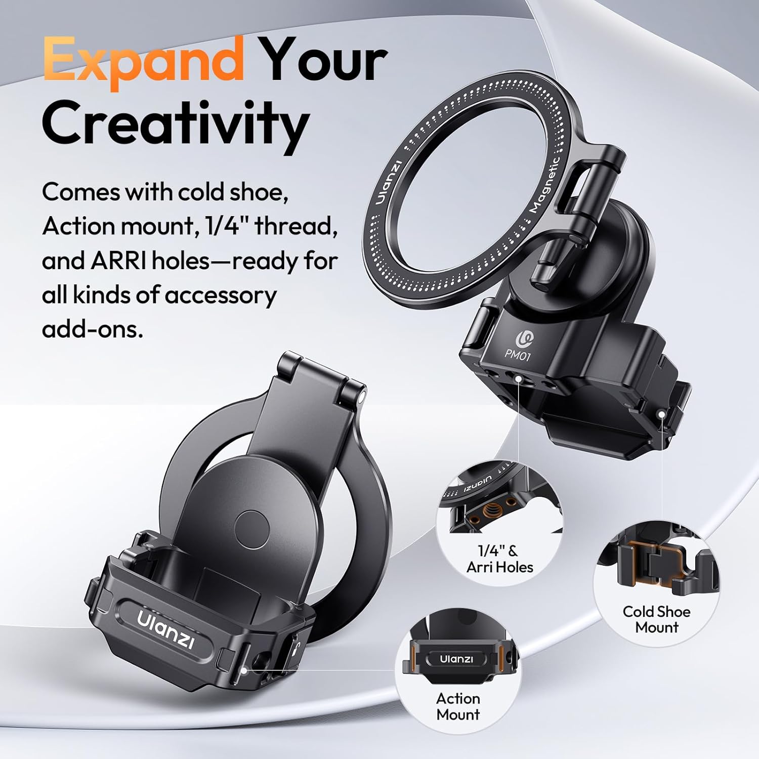 - 【Versatile Creative Extension】The ULANZI PM01 magnetic mount stand is equipped with a side hot shoe and foldable action camera, 1/4 inch screw hole, and ARRI hole design, more flexible and versatile. The Pocket 3 magnetic mount is compatible with a variety of accessories, such as microphones, lights, selfie tripods, and enhances your video recordings with excellent audio and lighting options.