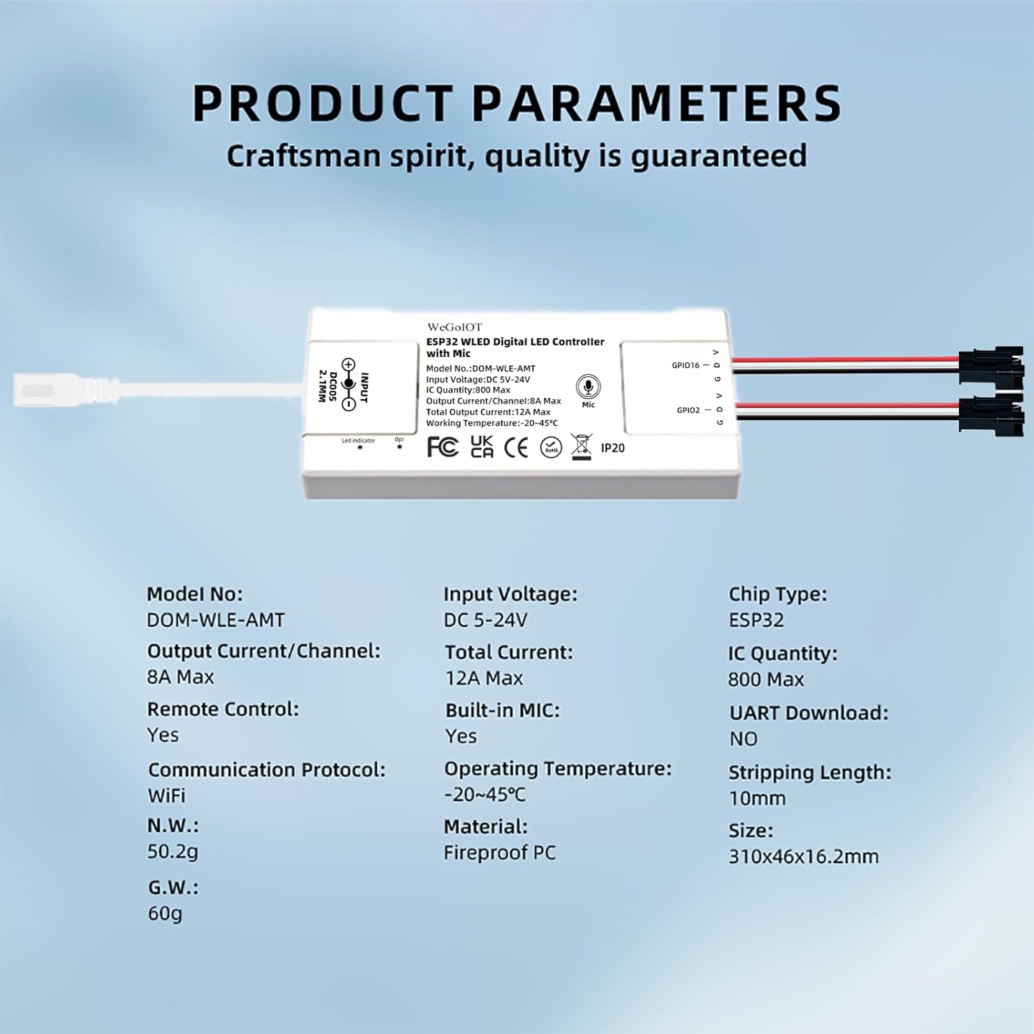 - 🥇Based on ESP32 Chip: Ensuring strong processing power and stable network connectivity, Dual independent control, Flexible drive,output Line: 2 cables with female connectors, input voltage:DC 5V-24V, total output current:12A Max, IC quantity:800 Max