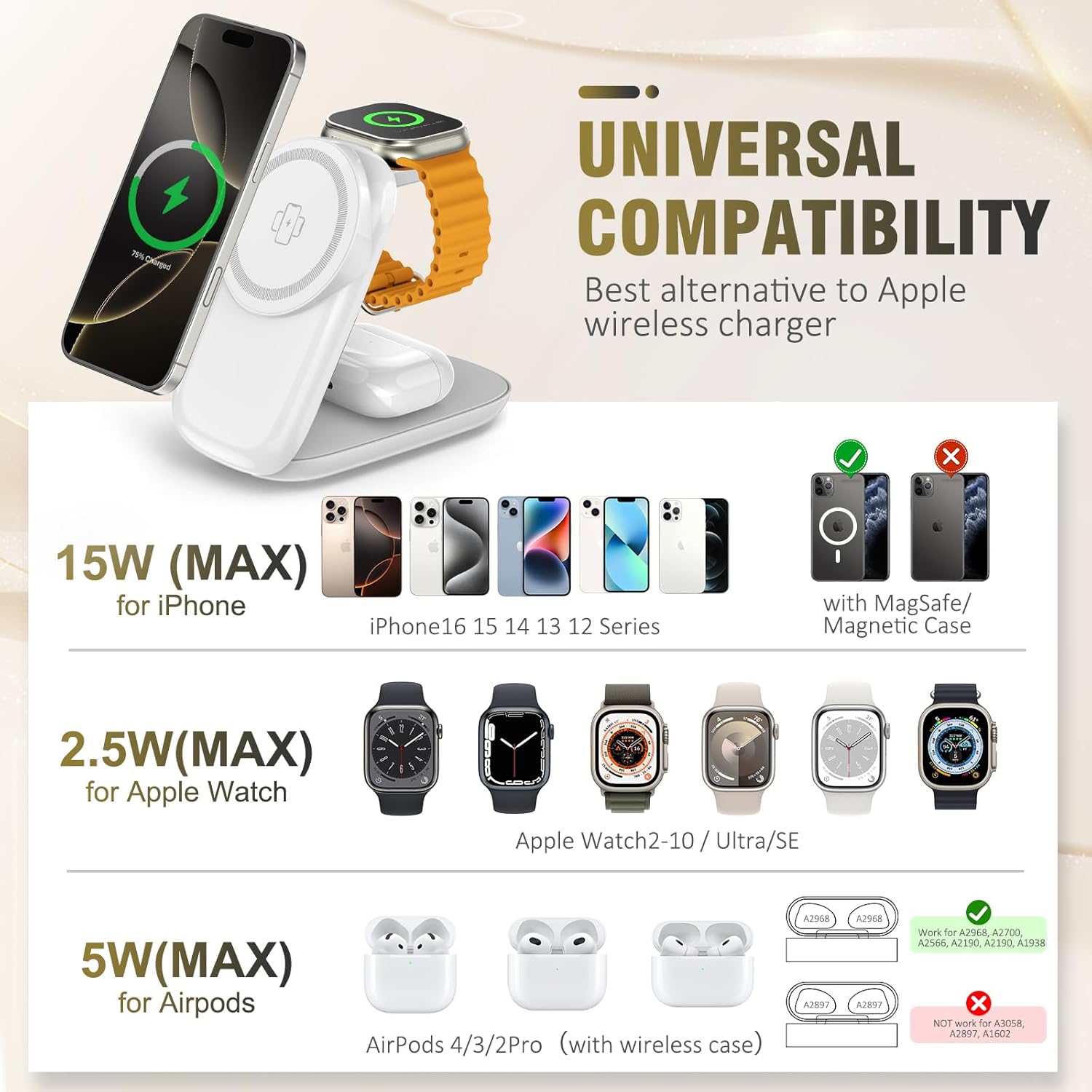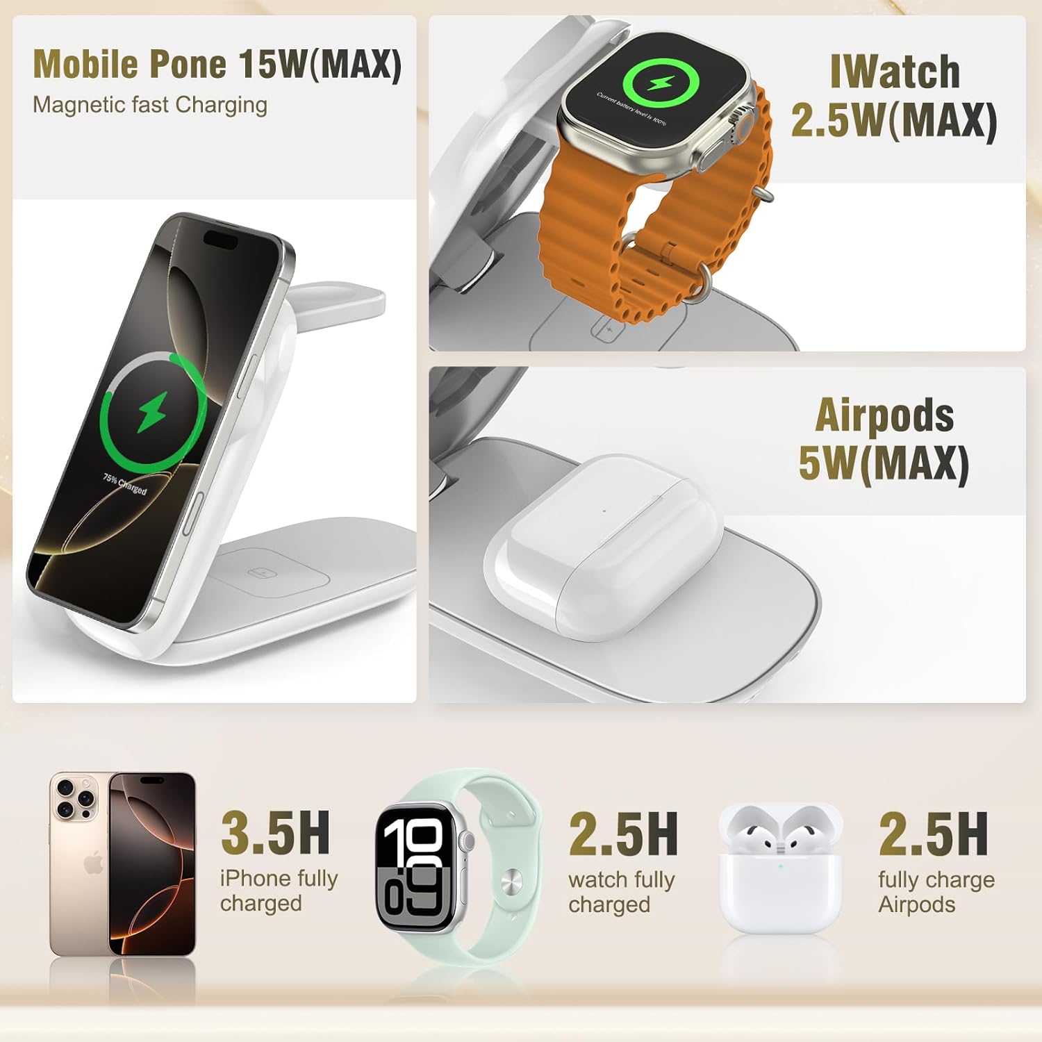 - 【2025 Upgraded 3-in-1 Wireless Charging Station】 Designed for Apple fans, this 3 in 1 charging station is perfectly compatible with iPhone 16/15/14/13/12/11/Pro Max series, Apple Watch 10/9/8/7/6/5/4/3, and AirPods Pro/4/3. Intelligent power distribution ensures efficient simultaneous charging for three devices, eliminating cable clutter—one station meets all your Apple charging needs. (Note: Only supports wireless charging devices; AirPods require wireless charging case compatibility.)