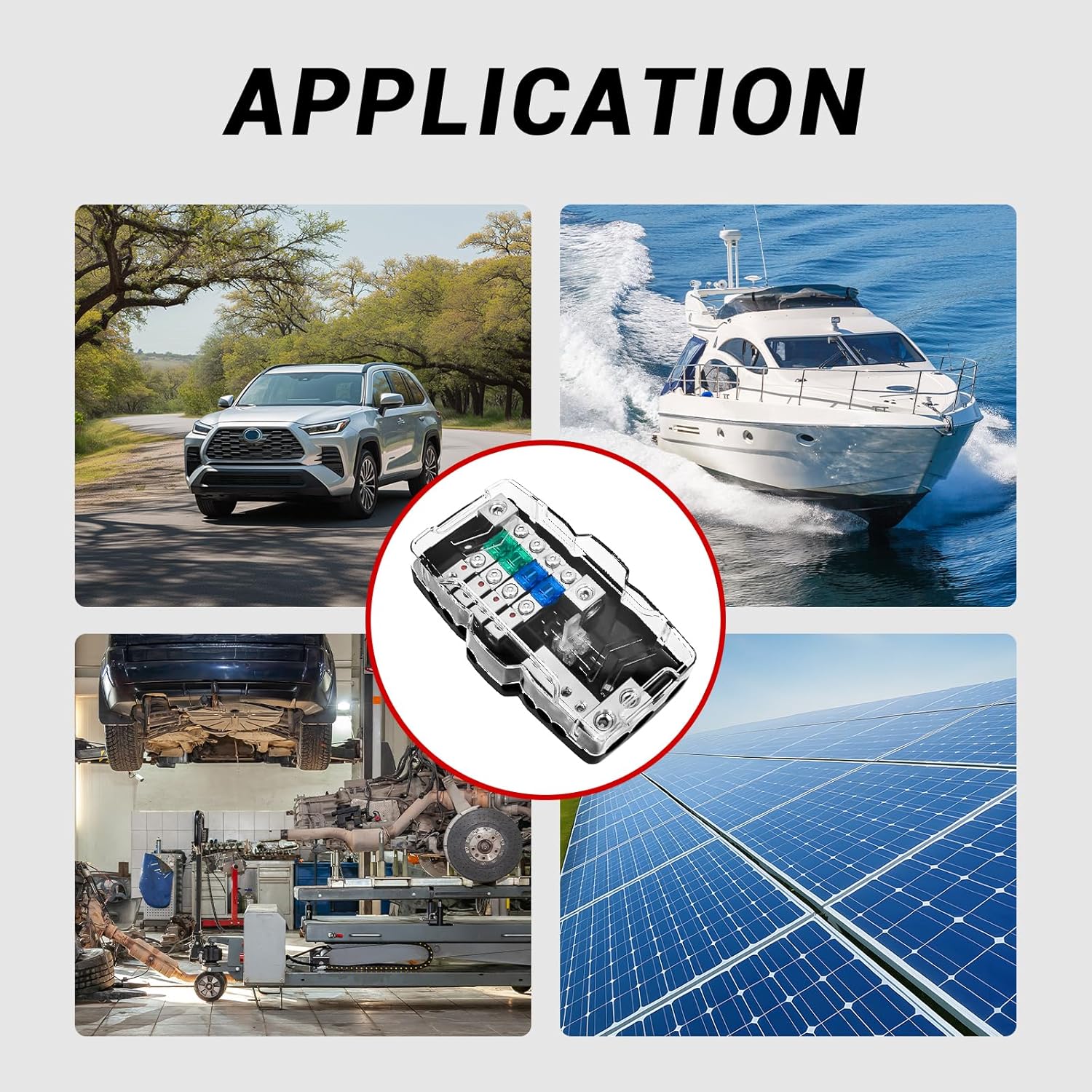 - Wide Application:Our Mini ANL fuse block is suitable for diverse scenarios such as forklifts, buses, electric vehicles, golf carts, wiring harness assembly, car audio systems,etc.