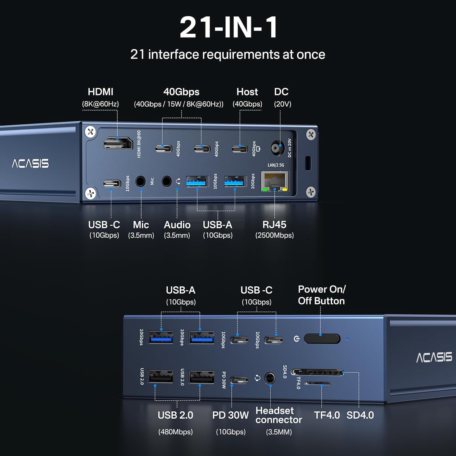 ACASIS 40Gbps Docking Station - 21 Ports,MacBook Pro Docking Station Dual Monitor, 8K60Hz HDMI, 2.5 GbE Ethernet, SD/TF 4.0, 10Gbps 7*USB C/A, 3.5mm Audio, 40Gbps Dock for Mac/Dell/HP/Lenovo/ThinkPad