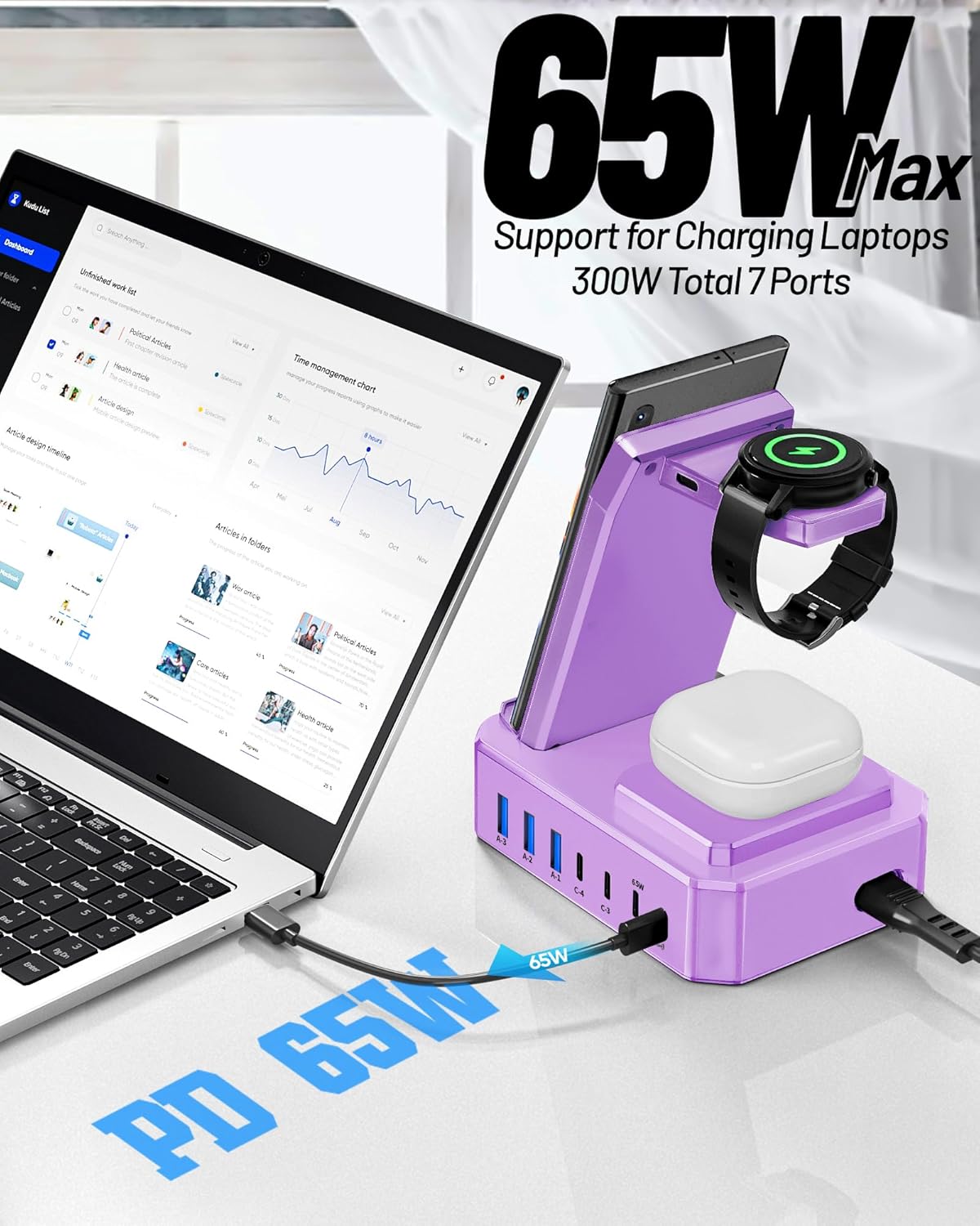 - 【300W Charging Station for Multiple Devices】: Charges up to 10 devices simultaneously.This desktop phone charging station is the perfect solution for charging multiple devices! Our charger station features 2 powerful 65W USB-C ports designed specifically for charging laptops, 2 efficient 30W USB-C ports and 3 versatile 30W USB-A ports . Samsung wireless charging station total output can be up to 300W. You can conveniently fast charge your samsung devices and other devices at the same time.