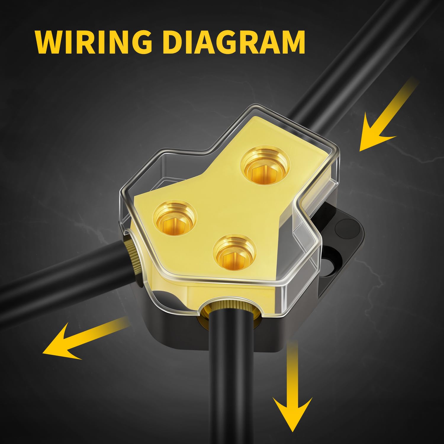 - 【Specification】: 2-Way 12v power splitter block, 1 x Input hole, 2 x Output hole, 0/2/4 Gauge AWG In, 4/6/8 Gauge AWG Out. Widely used in Audio System, suitable for Automotive, Car, Truck, Marine, Boat, etc.
