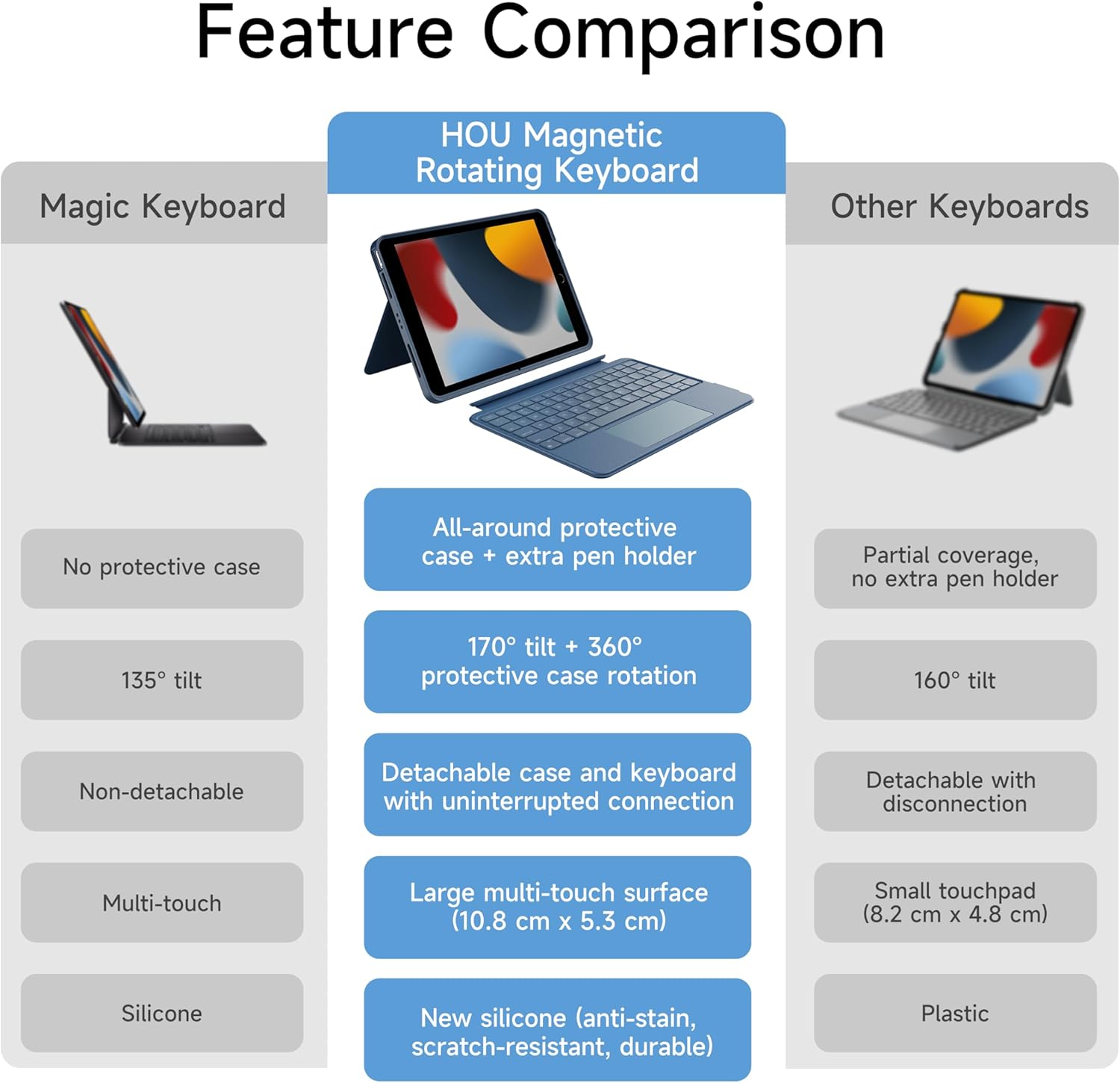 - [Comprehensive iPad Protection]: Designed for durability, the HOU iPad keyboard case is crafted from high-strength silicone, providing 360° all-around protection. Elastic and magnetic holders keep your Apple Pencil secure, ensuring it’s always within reach