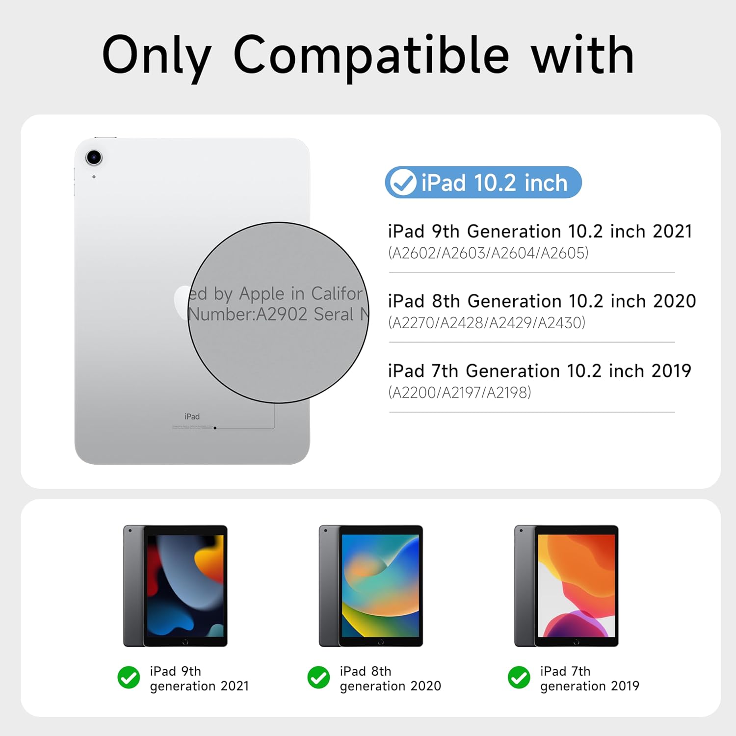 - [Compatibility]:Compatible with the following models: iPad 9th Generation 10.2 inch 2021(Model Number:A2602/A2603/A2604/A2605) iPad 8th Generation 10.2 inch 2020(Model Number:A2270/A2428/A2429/A2430) iPad 7th Generation 10.2 inch 2019(Model Number:A2200/A2197/A2198)