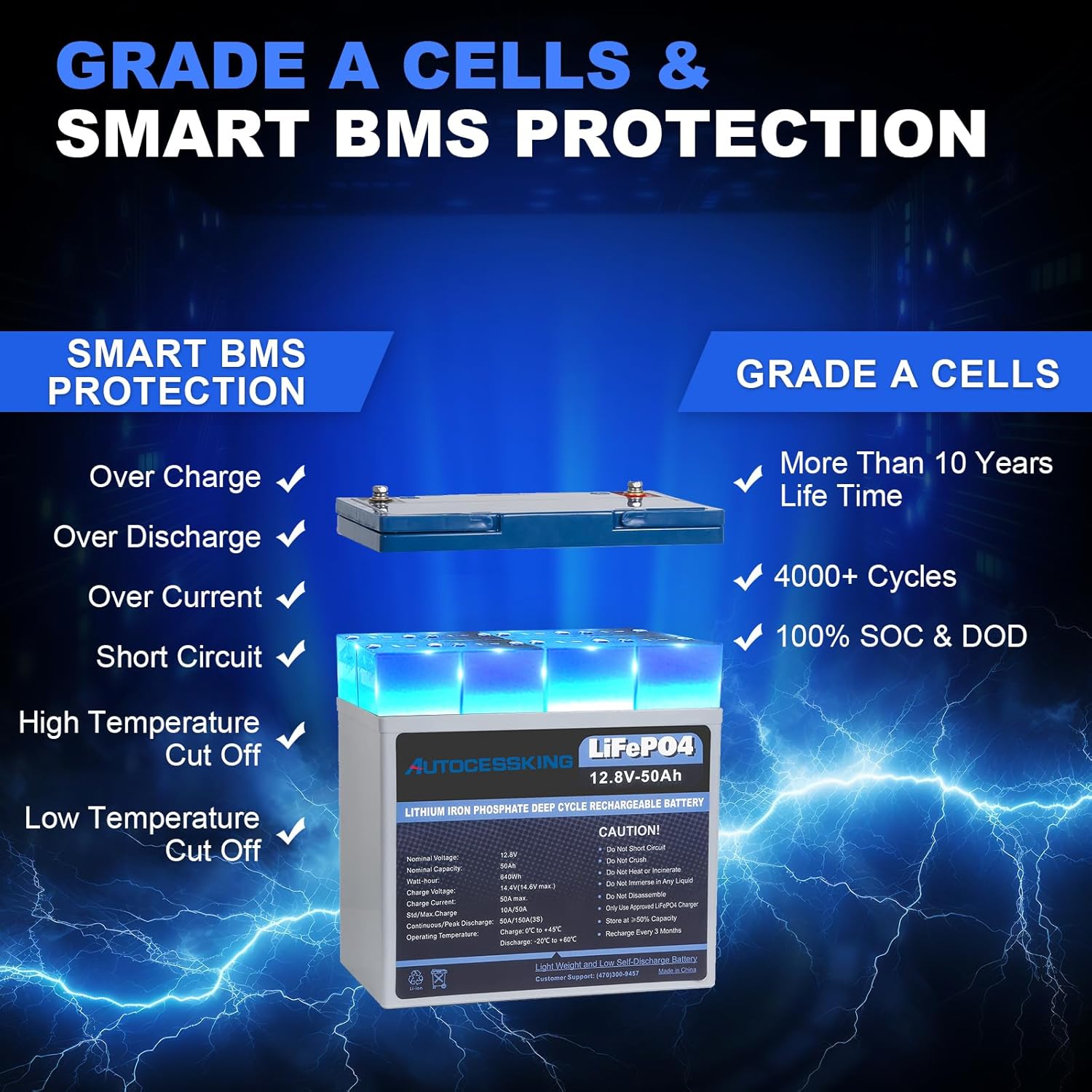 - ✅ GRADE A CELLS & SMART BMS - The built-in Battery Management System (BMS) protects your battery from Over Charge and Discharge, Over Current, Short Circuiting, as well as Low and High Temperature for increased performance and longer life. The BMS will automatically cut off the battery and the voltage will drop below 1V. Only when the circuit is cut off, the battery will automatically reactivate after 1 second (No longer need a higher voltage input to activate).