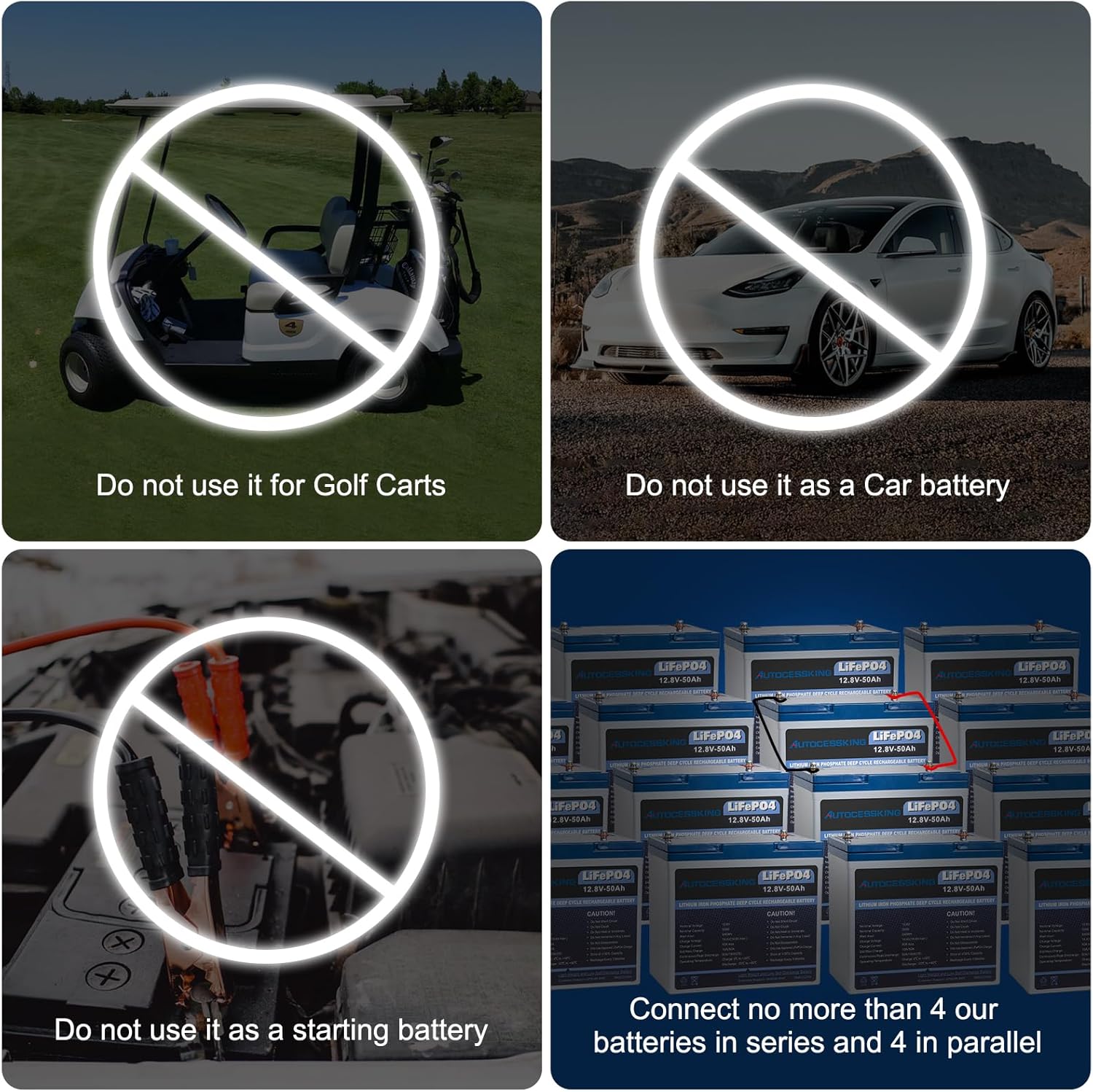 - ✅Autocessking 12V lithium battery is designed for energy storage purpose only. We do not recommend using it as a starting battery for cars or golf carts.