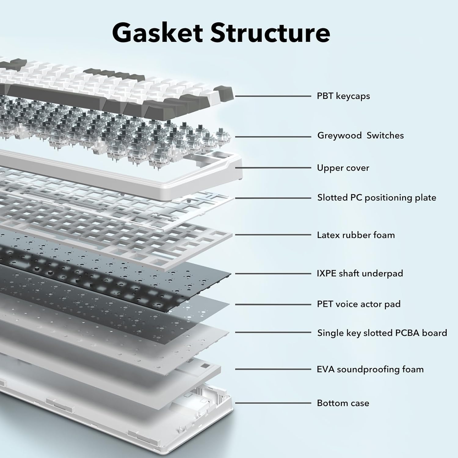 - 【Gasket Structure with Sound Absorbing Foams】 GASKET structure ensures the highest quality assurance with great durability and stable performance. Equipped with 4 layers of thicker sound-absorbing foams, silicone dampener pad, which reduces 40% noise and removes 80% hallow sound. Bringing creamy sounding, natural and clear feedback, no more cavities noise.