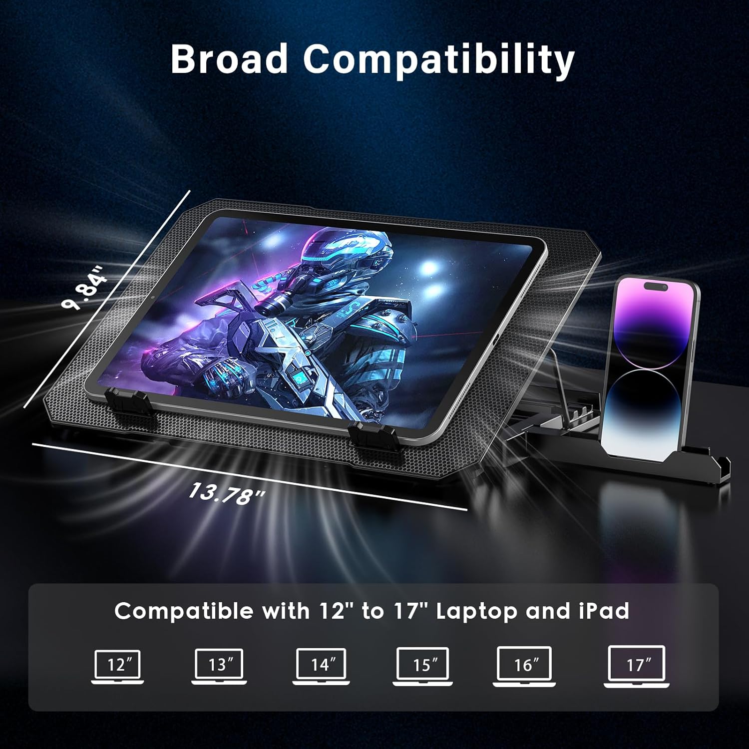 Laptop Cooling Pad, Laptop Cooler 6 Quiet Fans for 12"-17" Laptops, Laptop Cooler Stand with Phone Stand, Gaming Laptop Fan Cooling Pad Slim Portable USB Powered with 5 Angle Adjustable, 2 USB Ports