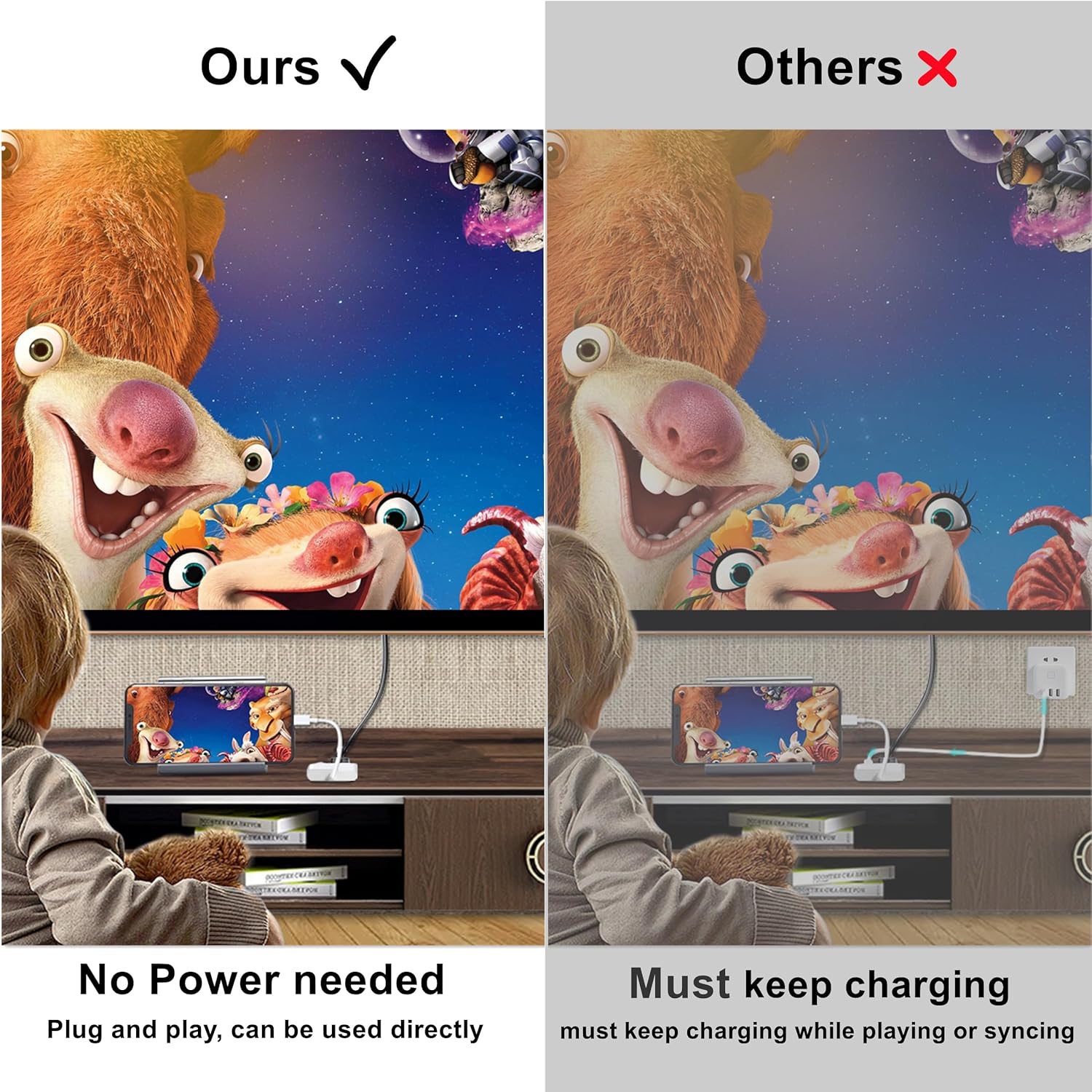 - No Power Needed: This HDMI to Iphone Adapter no need power, no need to install any driver/app or connect Wifi. Not like other hdmi adapter for iphone must plug charging cable while using. This HDMI adapter is very easy to use, plug and play.