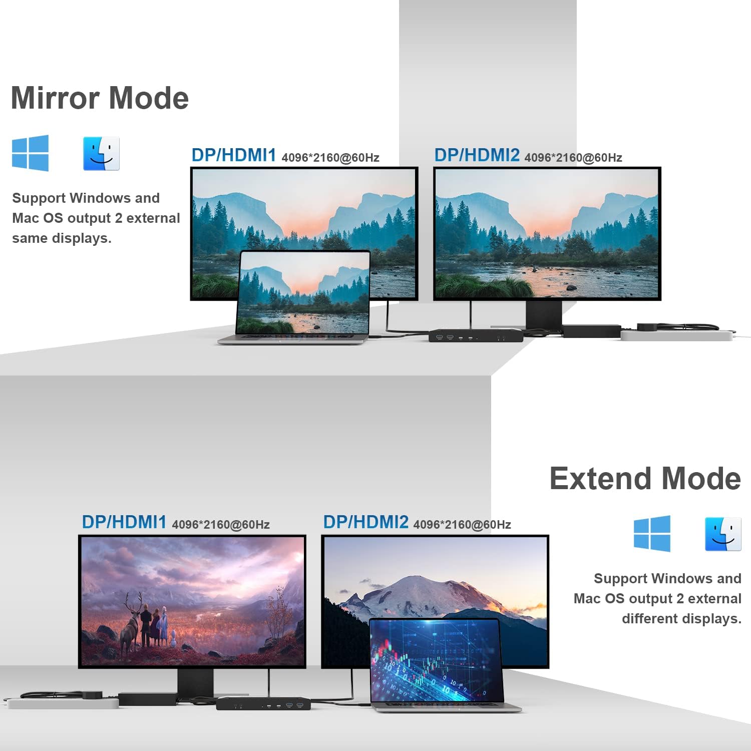 - Flexible Video Interfacing: Allowing support for the most prevalent DP and HDMI displays. The maximum resolution will be 5120x1440p60 (5K UItrawide) or 4096x2160p60 (Cinema 4K) if both DisplayPort video outputs for dual monitors. Dual HDMI / HDMI +DisplayPort resolution up to 3840x2160@60Hz or 4096x2160@60Hz (Cinema 4K). DisplayLink technology enables adding two extended screens to M1 / M2 / M3 / M4 Macs, making it the ideal universal docking station.