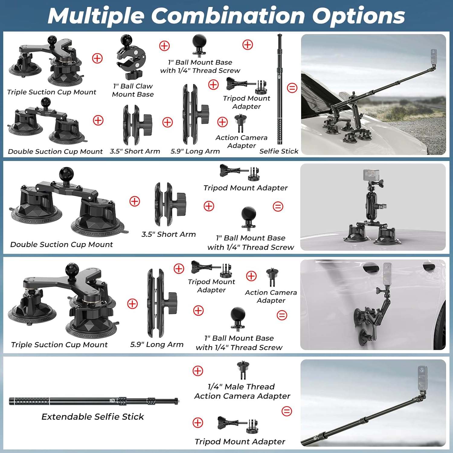 - Product List: Aluminum Alloy Extendable Selfie Stick x1, 1" Ball Double Suction Cup Mount x1, 1" Ball Triple Suction Cup Mount x1, 1" Ball Claw Mount Base x1, 3.5" Length Short Double Socket Arm x1, 5.9" Length Long Double Socket Arm x1, 1" Ball Mount Base with 1/4" Thread Screw x1, Tripod Moun Adapter with 1/4" Female Thread Hole x1, 1/4" Male Thread Action Camera Adapter x1, Screw Cover x1, 2mm Allen Wrench x1, 3mm Allen Wrench x1