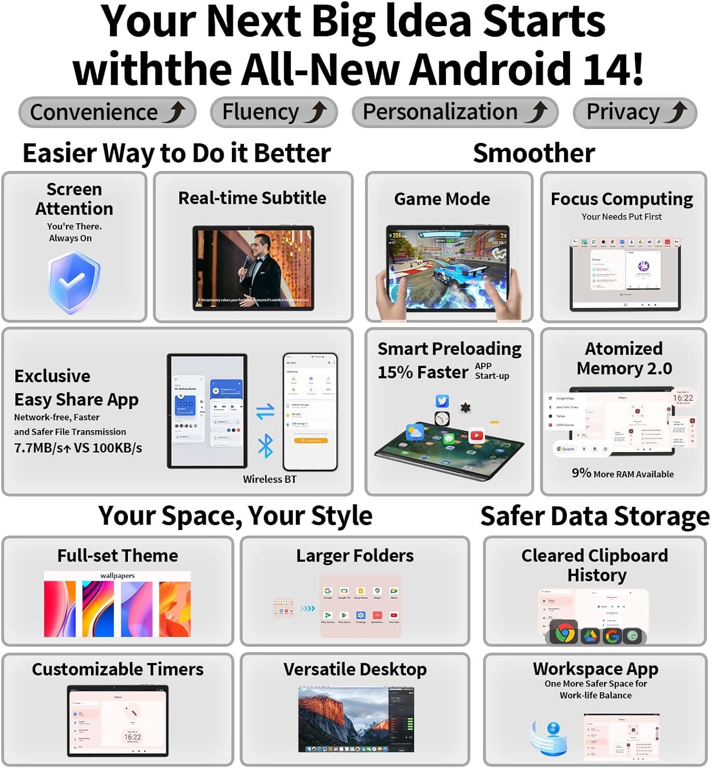 - 【26GB RAM + 256GB Storage (Expandable up to 2TB)】Our Android tablet comes with 26GB of RAM (6GB physical + 20GB virtual) and 256GB of built-in storage for a seamless multitasking experience. Expandable up to 2TB via TF card (sold separately), it's ideal for storing photos, videos and large files. GMS-certified tablet ensures smooth app downloads and a lag-free experience
