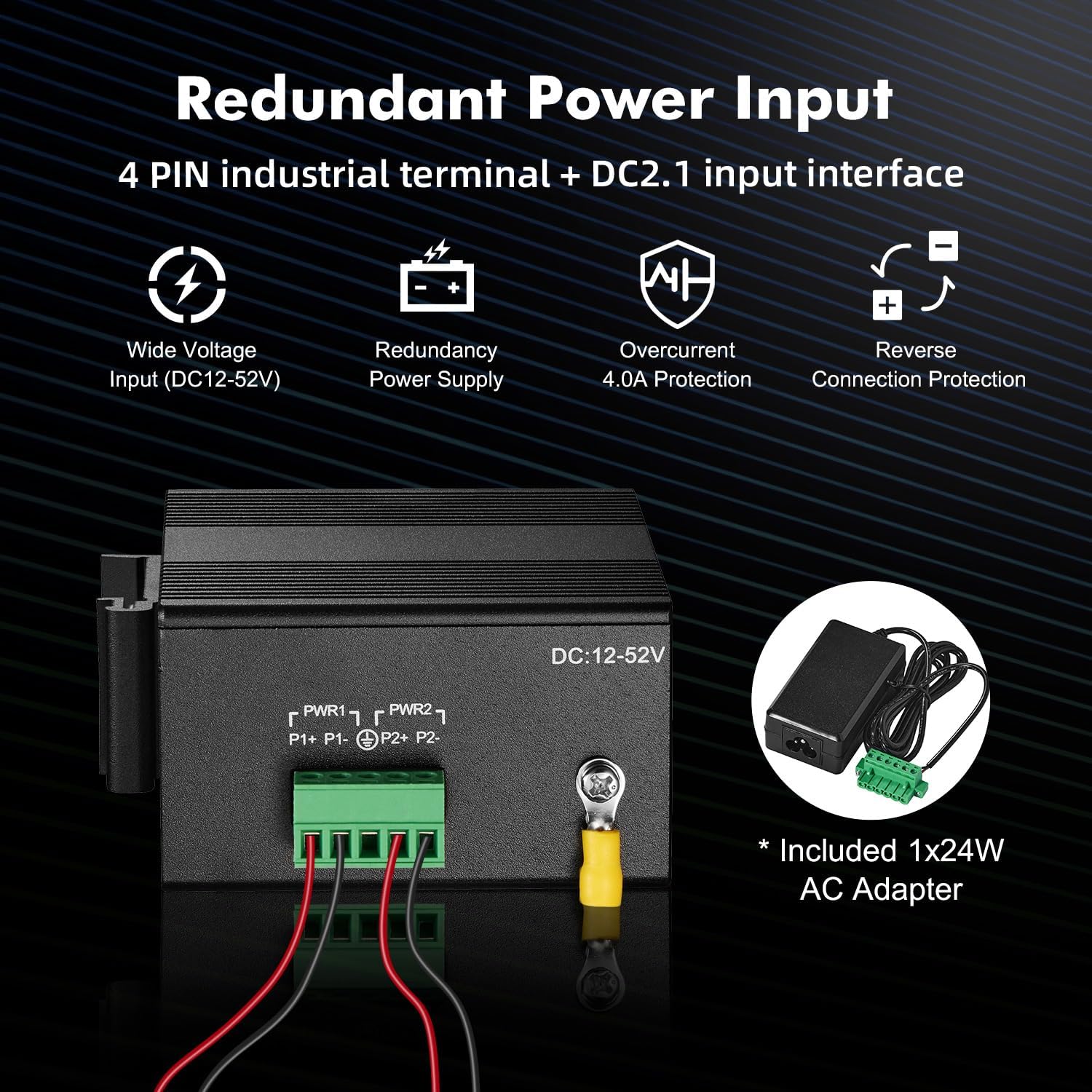 - Dual power supply, automatic fault switching, anti-reverse connection does not damage the equipment, higher reliability, equipped with one UL-certified power adapter, can be used without additional purchase