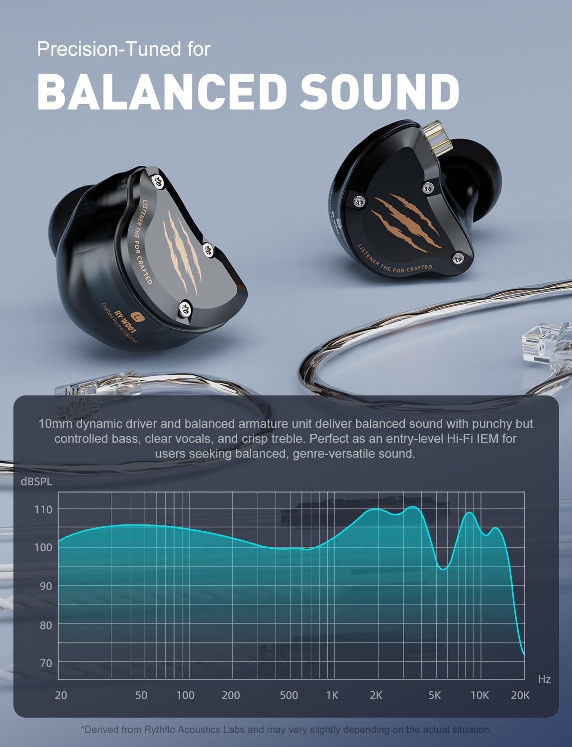 - 1BA+1DD Dual Hybrid Driver IEM: Balanced, textured bass meets bright, articulate vocals — thanks to a 10mm Dynamic Driver and Balanced Armature Unit—delivering detailed, natural sound for everyday listening