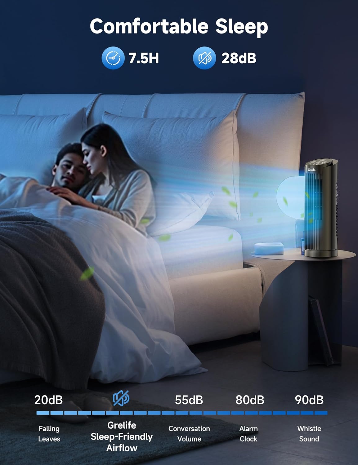 Grelife Tower Fan, 13" Electronic Model with Remote Control, 28dB Quiet Operation, 90° Wide Oscillation, 3 Speeds, 7.5H Timer, LED Display, Bladeless Safe Design for Bedroom Office Home Dorm and Desk