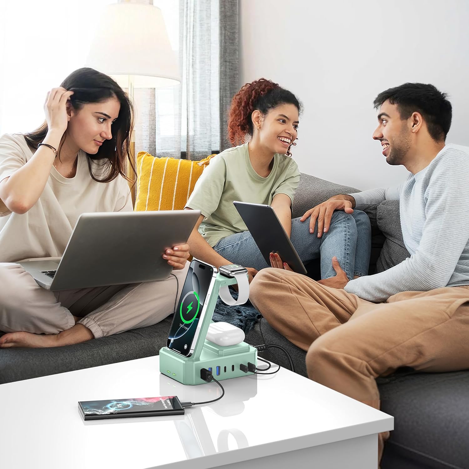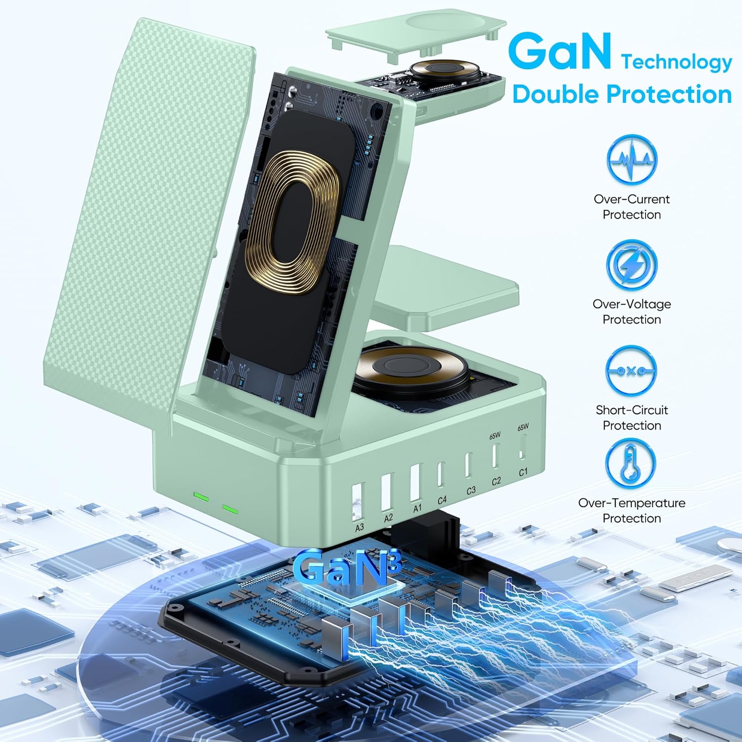 - 【300W USB C Charging Station for Multiple Devices】: This desktop multi-port charging station is the perfect solution for charging multiple devices! Our usb c charging station features 2 powerful 65W USB-C ports designed specifically for charging laptops, 2 efficient 30W USB-C ports and 3 versatile 20W USB-A ports . Together with wireless charging station total output can be up to 300W. You can conveniently fast charge your Apple devices and Android devices at the same time.