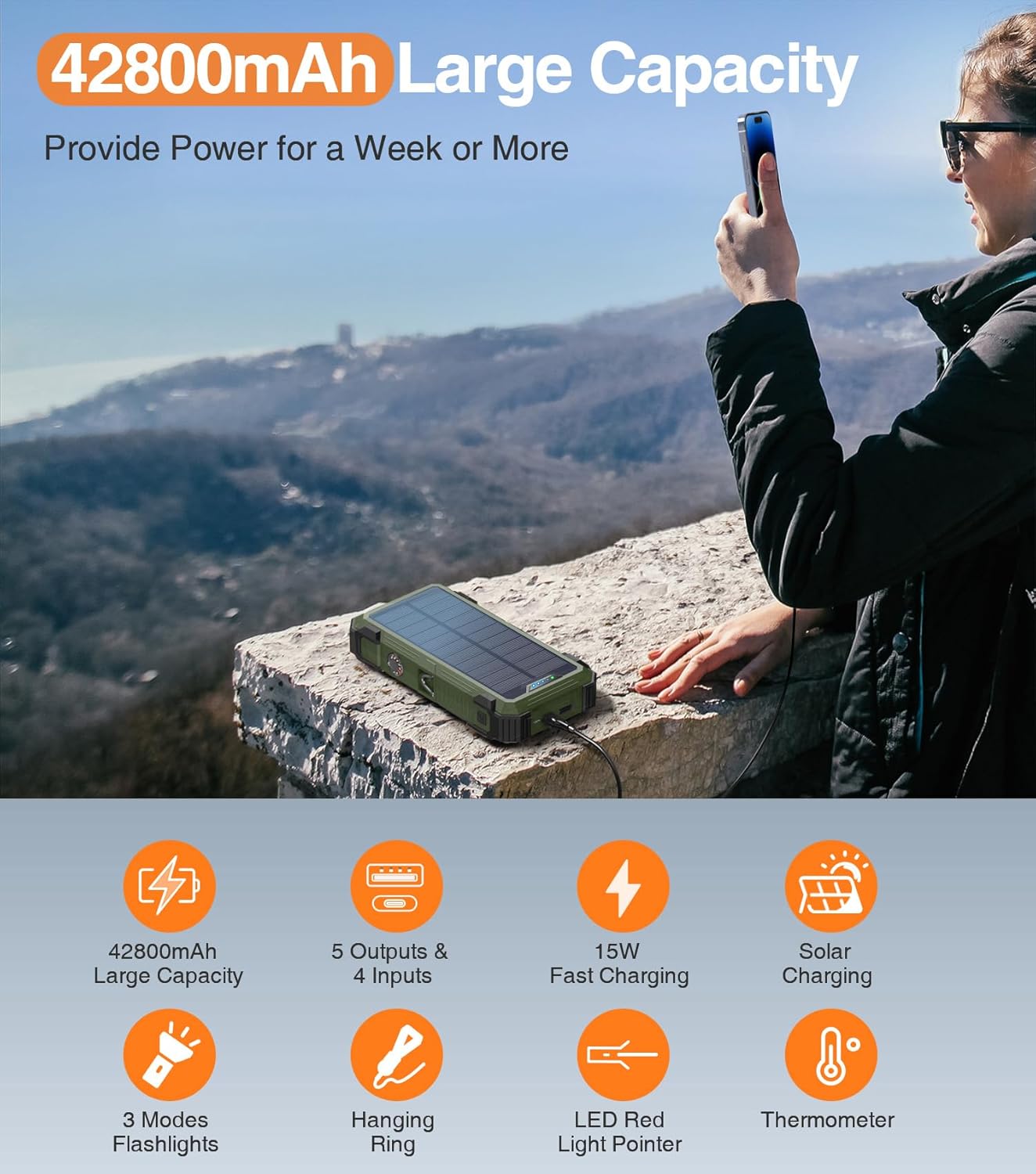 - Massive Power, Lightning-Fast Charging and Big Capacity, Small Worries: With a 42,800mAh capacity, this charger powers multiple devices multiple times. Recharge via adapter or solar power, backed by an intelligent IC chip for safe, 15W fast charging through multiple ports."