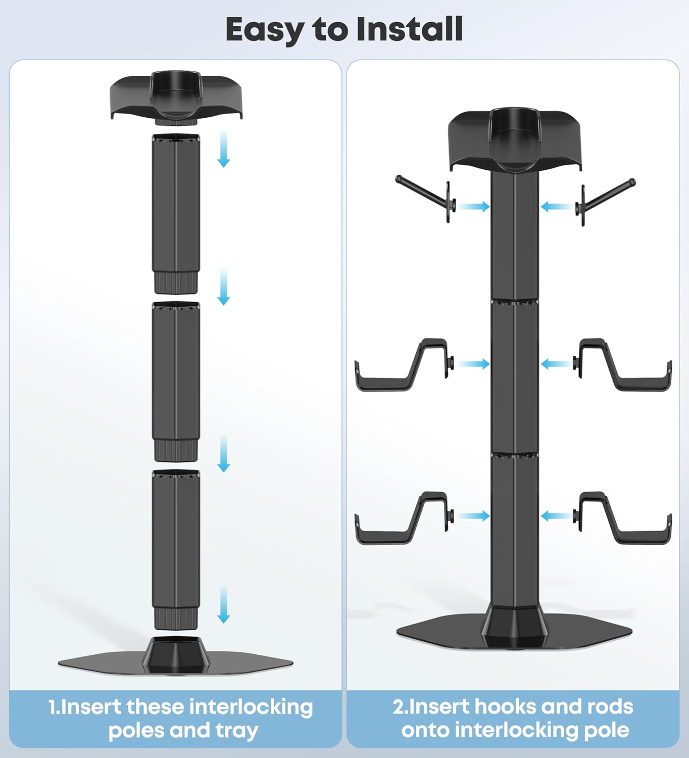 - Easy to Install: It takes 2 steps to finish installation. The first step is to insert interlocking poles and tray. The second step is to insert hooks and rods onto interlocking pole. After finishing the above 2 steps, you can hang different gaming devices according to your preference.