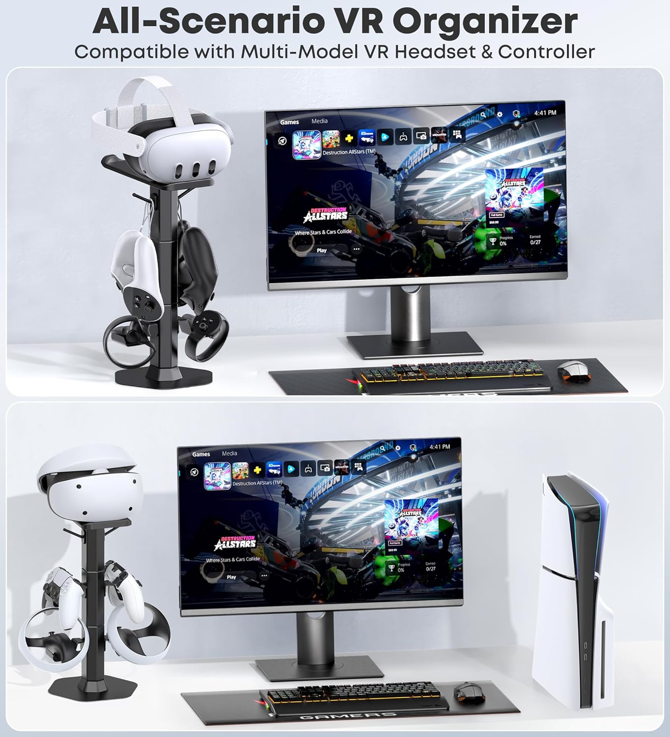 - Universally-Compatible storage holder stand: This headphone stand for desk is super versatile and can be placed in various scenarios, such as on a desk, on a TV cabinet, and many other places.This game controller holder is compatible with many different models/types of controllers, such as PS5 controllers, Xbox controllers, PSVR2 controllers, etc.